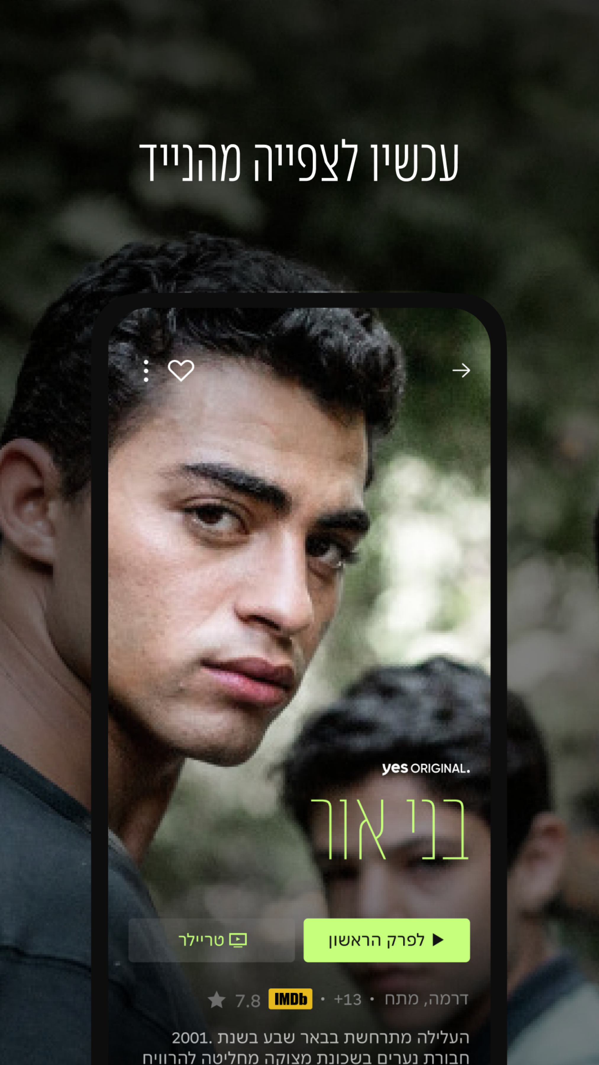 Customers yes? Get to know the yes + app for laptops and tablets. Yes's favorite content now in an innovative mobile viewing experience too! What awaits you in the app? • Personal profiles: A personal area for each member of the household, which is exactly right for the viewing experience he likes - with continued viewing, favorite channels and personal viewing lists, and in short - everything that really interests you, instead of being solely yours. • Download episodes directly to the device: No internet? No problem. Download the content you like directly to the device, and watch long trips, abroad and anywhere without an available connection to the network • Quality original productions: exclusive original originals content of yes with behind-the-scenes glimpses, interviews with stars, special excerpts and more. The world of tweens: A world especially worthwhile for the older children of yes, with the best series, recommendations from beloved stars and easy access to channels and programs in the adult area as well. • The world of kids: the world of the little ones of yes with lots of favorite characters, songs and special collections, in a safe interface and adapted for children, including a timer for restricting viewing, blocking content and more. • Advanced broadcast schedule: an especially innovative and convenient panel, which will allow you to easily skip between channels, watch episodes from last week and be updated on what will be broadcast next week. • And of course, all the convenient features from the TV: Bing, StartOver and CatchUp for a comfortable and complementary viewing experience, just like you are used to from the big screen We will meet in the app, Yes + team