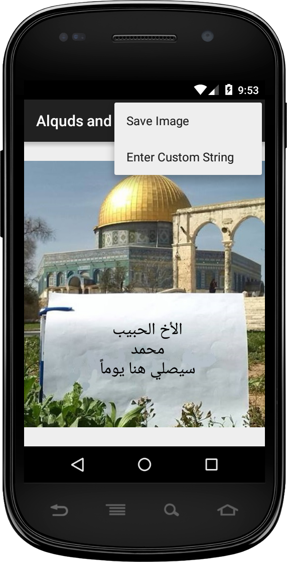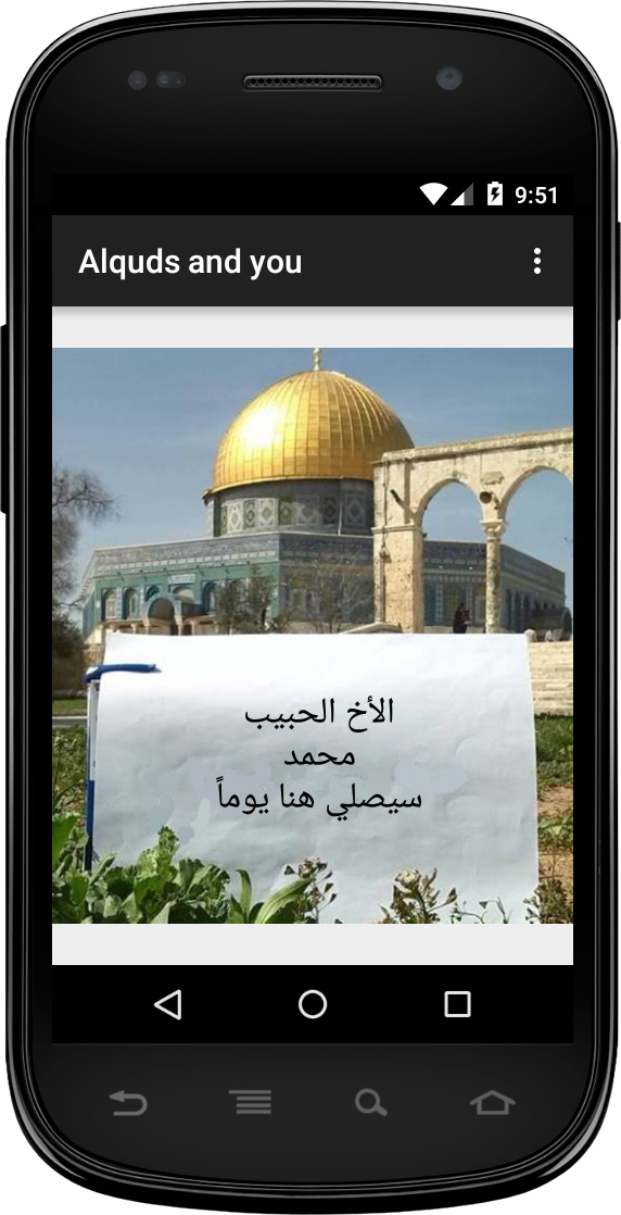 This application allows you to write your name and gender and then it will generate an image contains paper with a message specially for you from AlQuds, captured with Alaqsa background. You can also save the image to share it with your friends. You can add customized text to be written on the paper.