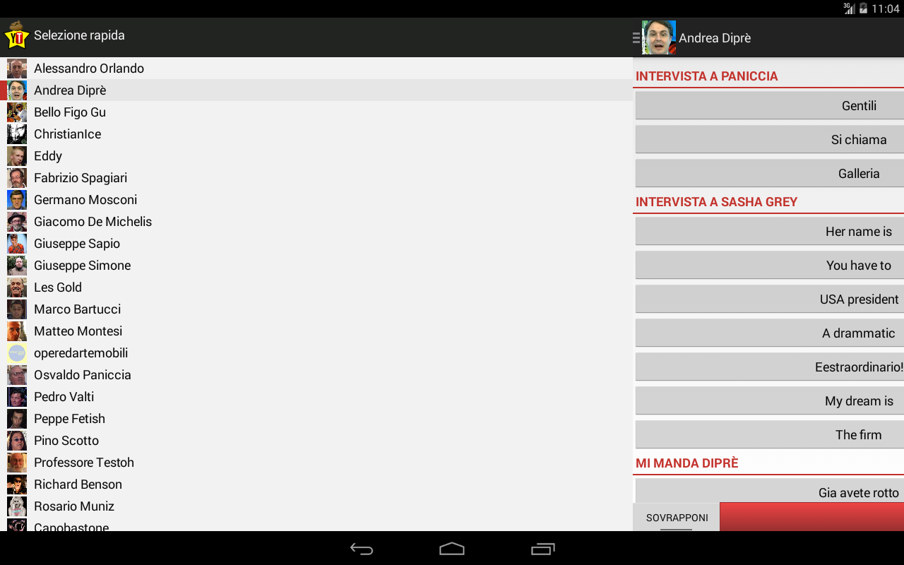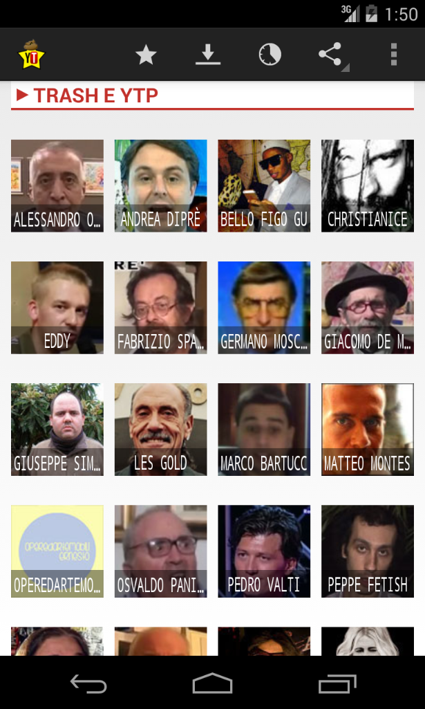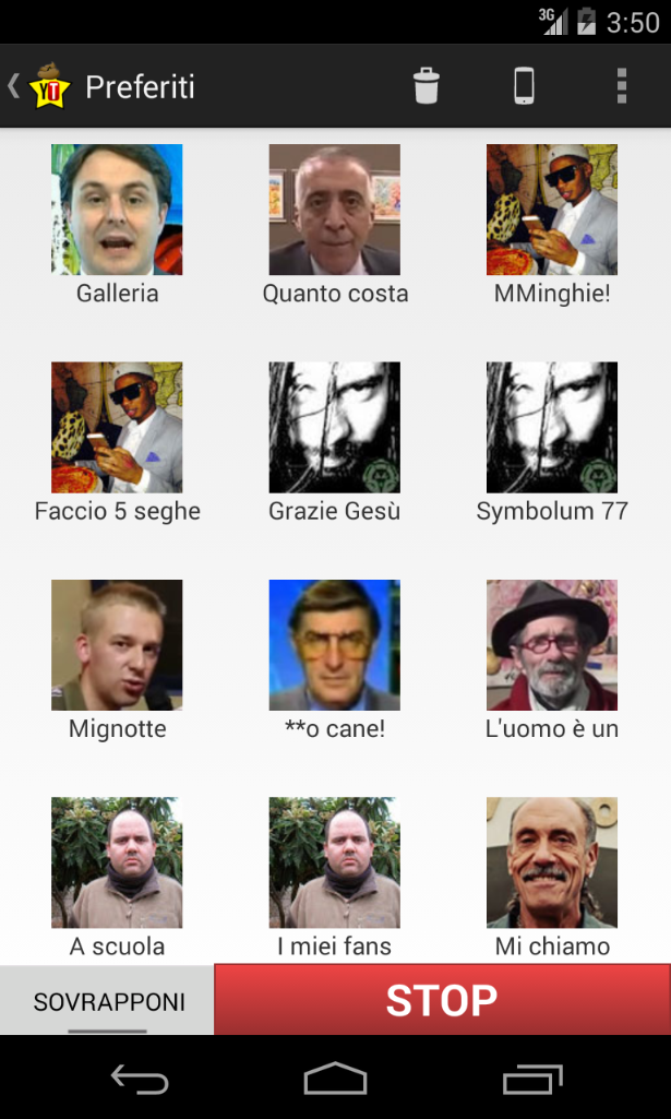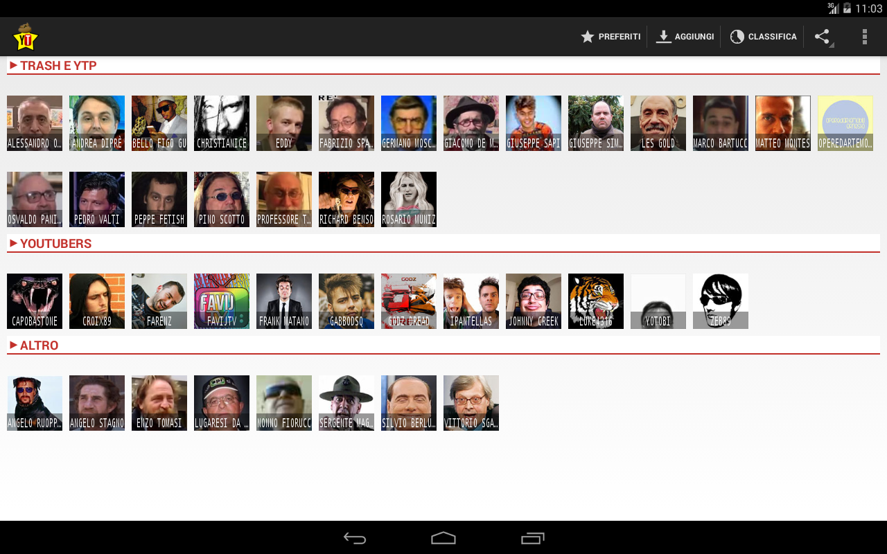 YT Stars raccoglie le frasi dei personaggi trash di YouTube e non, come: Rosario Muniz, Germano Mosconi, Bello Figo Gu, Bear Grylls, Giuseppe Simone, Sergente Maggiore Hartman, GODz Dread, Giuseppe Sapio, Les Gold, Nocoldiz, Richard Benson, Silvio Berlusconi e molti altri... [LISTA COMPLETA GIÙ] Con YT Stars! Sound-board potrai: •Riprodurre oltre 2500 suoni di oltre 60 personaggi anche offline. •Condividere i suoni con app di IM come WhatsApp •Decidere il personaggio da aggiungere nella prossima versione, votandolo tra un'ampia lista di candidati presente all'interno dell'app e visionabile nel nostro sito ufficiale: http://www.ytstars.it/nuovi-personaggi/ •Creare una lista di suoni preferiti per mischiare tra di loro più personaggi, proprio come se fosse una YTP •Aggiungere scorciatoie per riprodurre i suoni direttamente dalla home Se un personaggio non è presente nella lista, contattaci tramite il menu opzioni dell'applicazione Lista completa: ►Trash e YTP •Alessandro Orlando •Andrea Diprè (catafratta) •Bear Grylls (pericoloso) •Bello Figo Gu (swag) •Bernice •Canazzo (jessica) •ChristianIce •Don Capucino (nus, dope) •Eddy •Fabrizio Spagiari •Germano Mosconi •Giacomo De Michelis •Giuseppe Sapio (sorrido sempre ciao) •Giuseppe Simone (monella) •Il Puma (se lo voglio) •Les Gold (mio figlio poteva morire) •Maccio Capatonda (italiano medio) •Mario Magnotta (lavatrice) •Marco Bartucci (nabbo) •Matteo Montesi •Nocoldiz (è finito il vino) •operedartemobili •Osvaldo Paniccia •Pedro Valti (la cipolla) •Peppe Fetish •Pino Scotto •Professore Testoh •Riccardo Il Grande (ah quetti bag) •Richard Benson (un pollo) •Rosario Muniz •Sarah Kennedy •Squallido Anal Smithee ►Youtubers •Capobastone •Croix89 •Dario Moccia (Nerd cultura, ciao bimbi) •DiddoMagikOfficial •Farenz •FavijTV •Frank Matano •Fuochico •GaBBoDSQ •GODz Dread •Homyatol (sdrogo) •iPantellas •Johnny Creek •JustZoda (melaagodo) •Luke4316 •Maurizio Merluzzo (Cotto & Frullato) •Milleaccendini (italia) •Quei Due Sul Server (QDSS) •Yotobi •Zeb89 (lezzo) ►Altro •Alberto Malesani •Angelo Ruoppolo •Angelo Stagno •Enrico Papi (moseca) •Enzo Tomasi (barbone di ostia) •Luca Giurato •Lugaresi da Cesenatico •Matteo Renzi (80€, shish) •Matteo Salvini (ruspe in azione) •Mattia Sangermano (bordello, fuoco alla banca) •Nonno Fiorucci (unghio incarnito) •Papa Francesco •Sandro Piccinini (ccezzionale) •Sergente Maggiore Hartman (palla di lardo) •Silvio Berlusconi (comunisti) •Tiziano Crudeli (gol) •Vittorio Sgarbi (capra) Disclaimer: Tutte le frasi, le immagini e le tracce audio contenute sono di proprietà dei rispettivi autori. I banner pubblicitari servono solo a ripagare l'iscrizione al market Google Play e a dare un contributo agli sviluppatori per il tempo impiegato