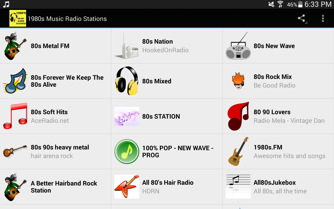 Listen to some fantastic 1980s music! Bring back your favorite music from the 80s with these online Internet radio stations. When Hair Metal, Punk, New Wave, Heavy Metal and Arena Rock ruled the airways, the 1980s were an exciting time in music. From the top 1980s music pop hits to hardcore heavy metal rock, we've got all the 80s music you will love. Over 40 great radio stations playing 1980s music round the clock 24/7. Our 1980's Music Radio Station app includes: 1) Hair Metal 2) 1980s Pop Hits 3) 80s New Wave Music 4) Metal and Arena Rock 5) 1980's Classic Rock 6) 80s Soul and R&B Music 7) Heavy Metal 8) Punk Rock 9) 1980s Dance Music 10) Hair Band ****************************************************** Note: Remember when loading any Internet radio station, you must wait for the audio stream to load with the **buffering** message for a few seconds before the music will start playing. Thank you for your patience. Some radio stations may be off the air for a few hours but if there is a radio station that has gone off the air completely, please send us an email. Internet radio has it's ups and downs, stations that work one day may be off the air the next day, please be patient and notify us when there are issues. If there is a non-working radio station, (ie: "error accessing audio file") please send us an email to notify us. And try another radio station.