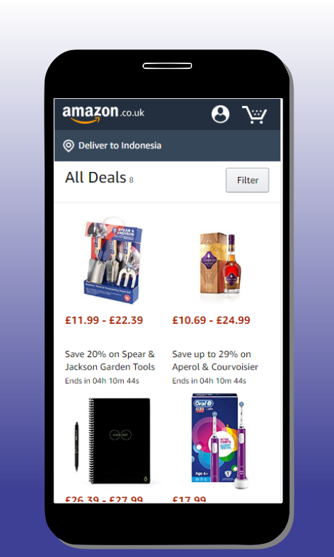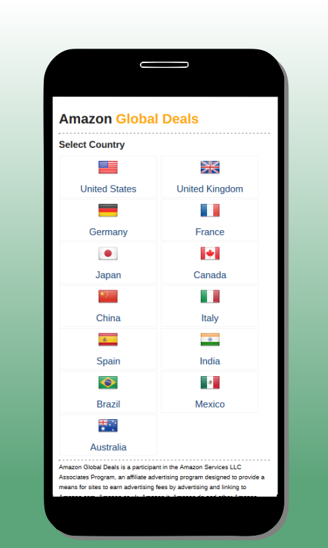 Shop Amazon's Deal of the Day, Lightning Deals, and Best Deals, featuring hand-picked deals with low prices on top products updated daily. United States (US) United Kingdom (UK) Germany (DE) France (FR) Japan (JP) Canada (CA) China (CN) Italy (IT) Spain (ES) India (IN) Brazil (BR) Mexico (MX) Australia (AU) Happy shopping!