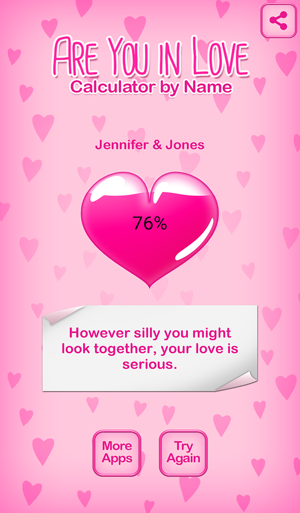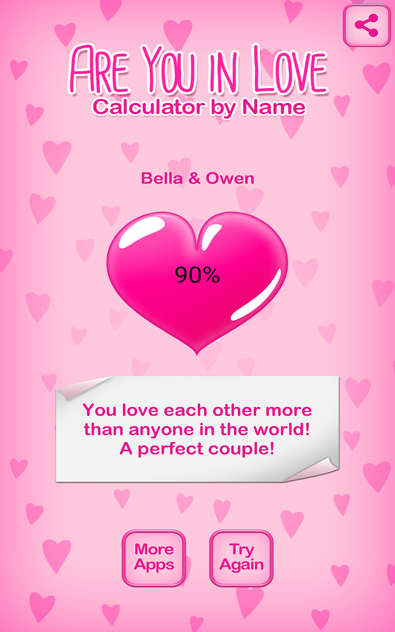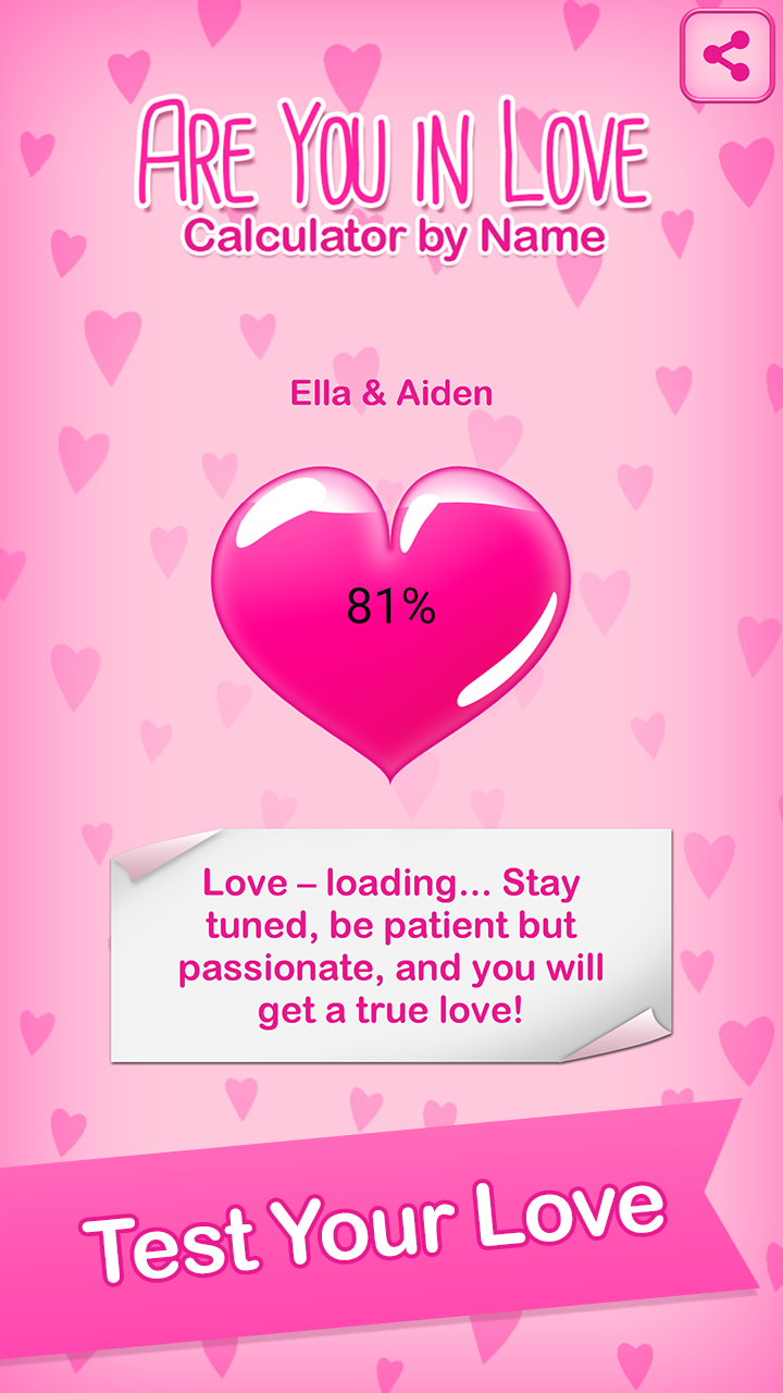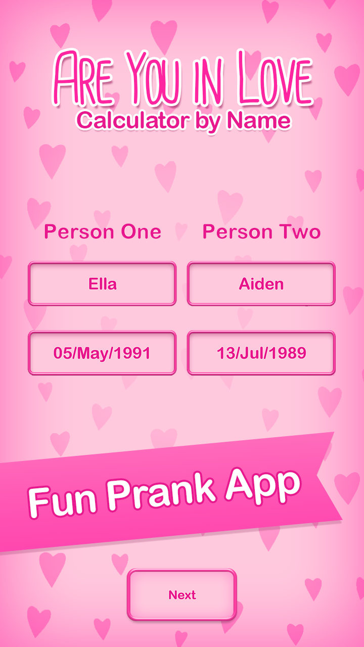 你約會這麼久, 你想檢查你的愛情狀況嗎?立即瞭解我們的新婚夫婦測試程式應用程式–愛測試 計算器的名稱 惡作劇!使用這個愛的測量應用程式來計算你與你選擇的人分享的感情的百分比。瞭解如何查看是否有人喜歡你, 並輕鬆檢查你們之間的相容性。只需以一種非常簡單的方式進行測試--輸入您的姓名、出生日期, 等待此媒人測試, 以獲得百分比, 以及描述您共用關係的愛情生活資訊。當然, 這是一個愛計算機惡作劇的應用程式, 所以使用它的樂趣, 不要把結果太重!下載和有樂趣使用我們最好的夫婦測試愛測試 計算器的名稱 惡作劇!