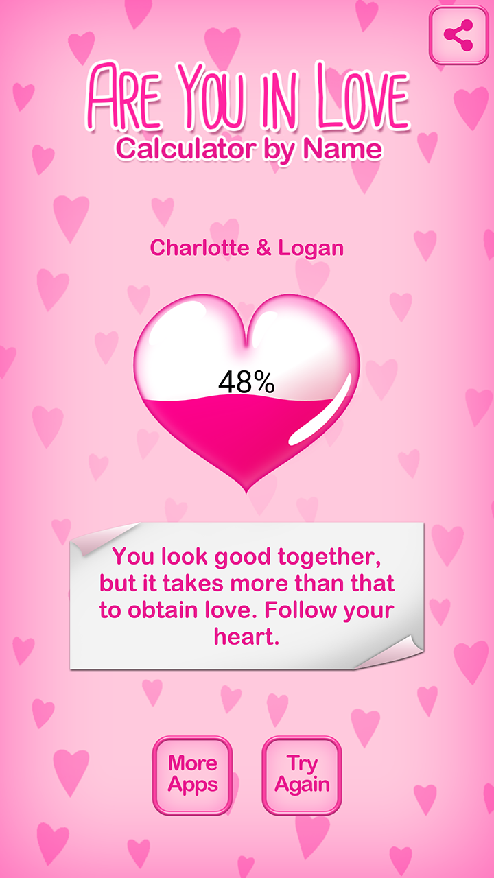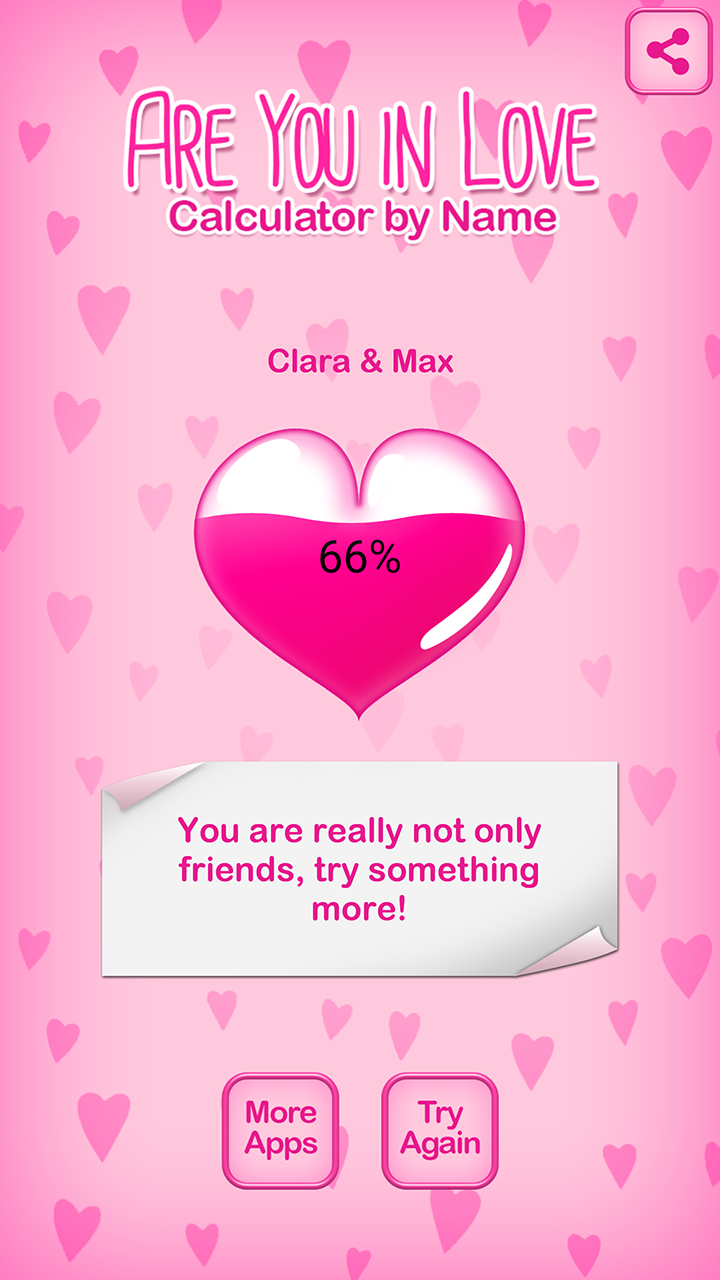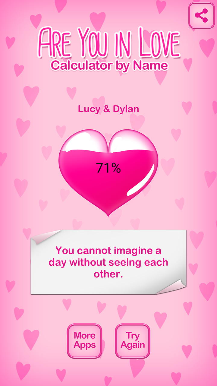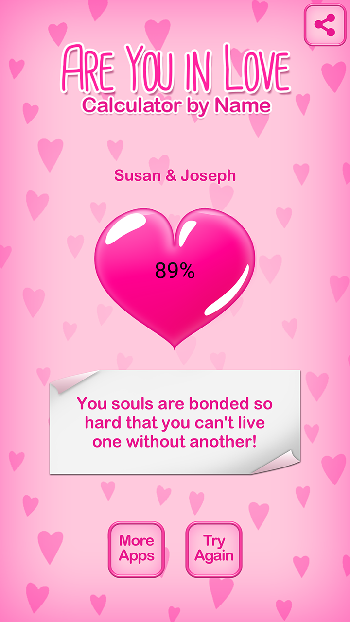 你約會這麼久, 你想檢查你的愛情狀況嗎?立即瞭解我們的新婚夫婦測試程式應用程式–愛測試 計算器的名稱 惡作劇!使用這個愛的測量應用程式來計算你與你選擇的人分享的感情的百分比。瞭解如何查看是否有人喜歡你, 並輕鬆檢查你們之間的相容性。只需以一種非常簡單的方式進行測試--輸入您的姓名、出生日期, 等待此媒人測試, 以獲得百分比, 以及描述您共用關係的愛情生活資訊。當然, 這是一個愛計算機惡作劇的應用程式, 所以使用它的樂趣, 不要把結果太重!下載和有樂趣使用我們最好的夫婦測試愛測試 計算器的名稱 惡作劇!