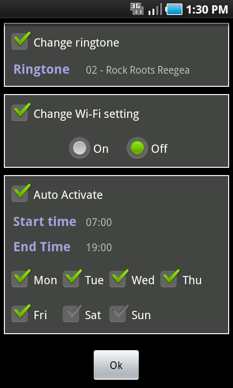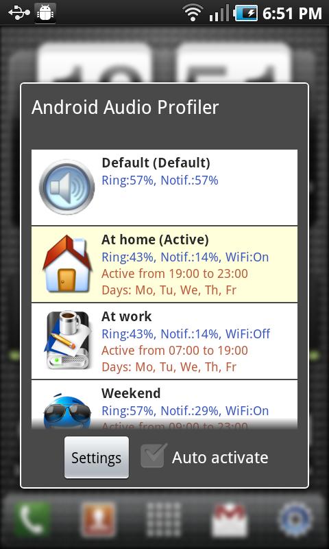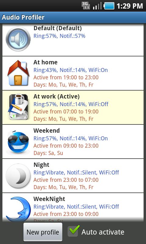 Easy and non-invasive manager to create custom profiles, specifying ringtone, volumes, WiFi and Bluetooth state, profile icon and vibration settings. * Widget for fast switch (long press on home to add) * High-res icons * Ringtone selection with sound preview * Messages in notification bar * Languages: English (default), Italian, French, Spanish Free version is limited to 3 profiles Full version enables unlimited profiles and time based auto-switch