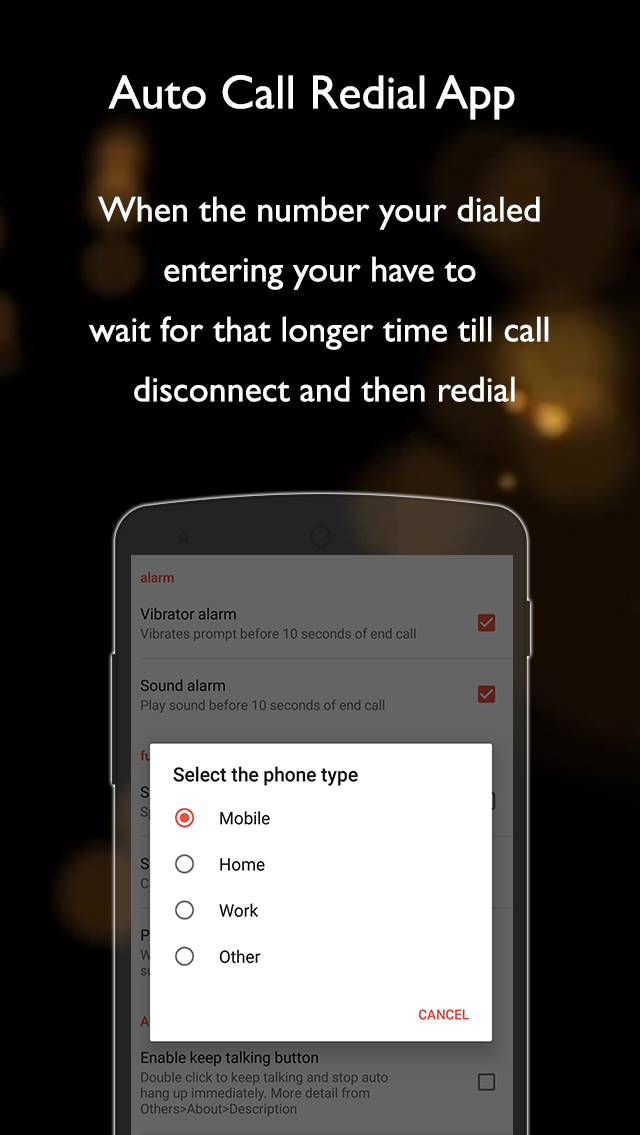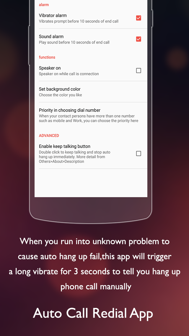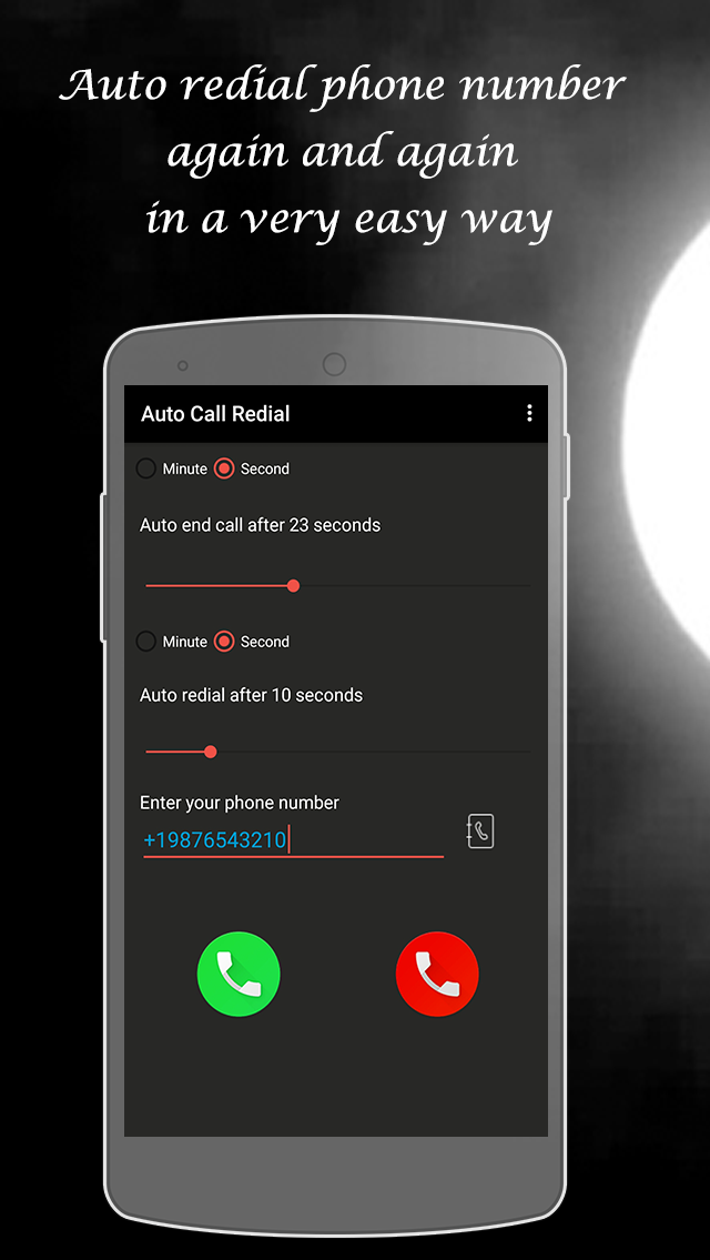 ● Support version Android 4.0 to 7.1 Line busy? Need to get in touch? Auto Redial lets you redial numbers automatically. Set the number, and the time between calls, and let your phone dial automatically for you. In the simplest case, for autodial you must enter the number to make a call and click Start. At the same time set the following parameters: - Duration of the call. - Number of calls (by default, 10). - The interval between calls (by default, 5 seconds). ● Main features: - When you run into unknown problem to cause auto hang up fail,this app will trigger a long vibrate for 3 seconds to tell you hang up phone call manually. • Busy lines won't keep you struggling to dial repeatedly any more. • Use it to get on-the-air of your favorite radio show, annoy a friend who'd never answer a call, win tickets to shows and sporting events or win your chance in connecting to a busy Call Center. ● Simple test steps - set hang up time to 10 seconds. - dial out to your friend - check whether auto end call within 10 seconds.