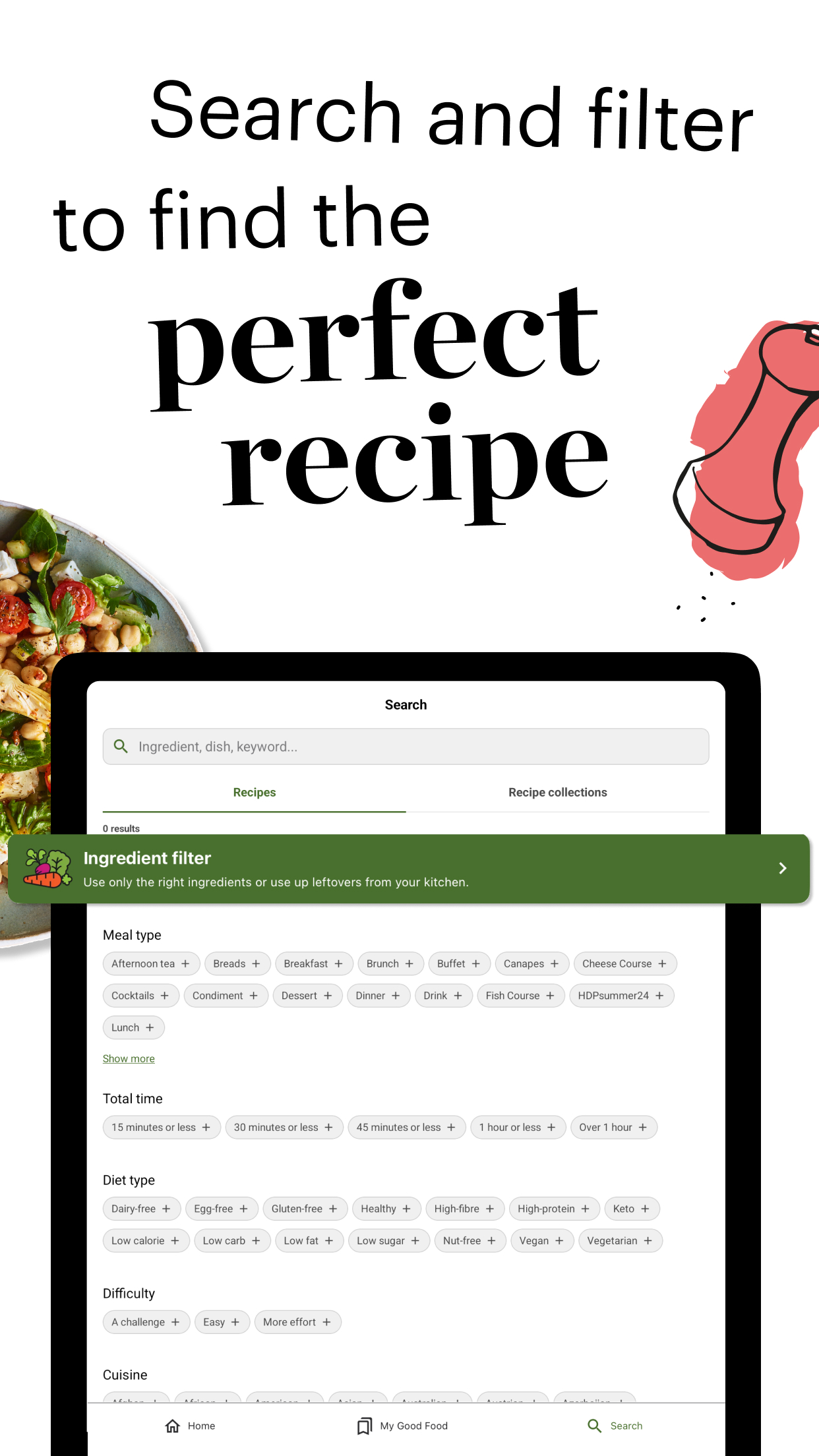 - 探索超過 17,000 道食譜,涵蓋晚餐、烘焙、大量烹飪等