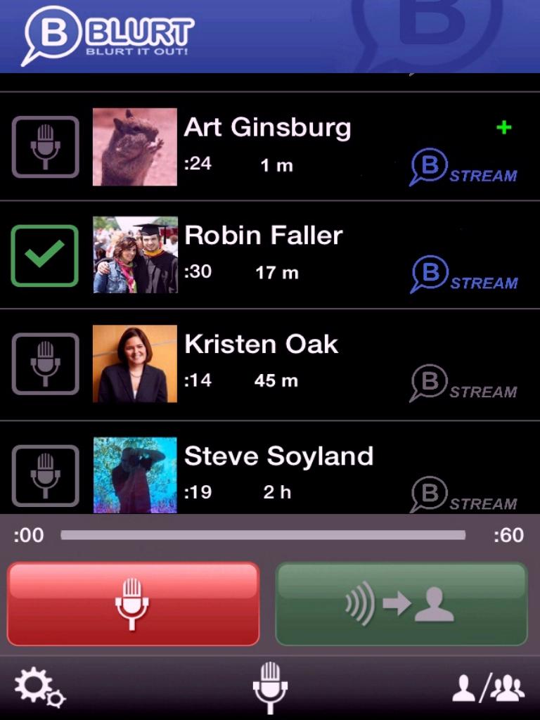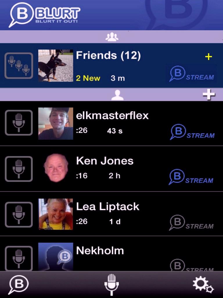 Got something to say? Just say it. Blurt makes communicating with friends, family, co-workers, or anyone as fast and simple as speaking. Use Blurt to talk with someone privately, or set up groups of people (Friends, Family, Co-Workers, Classmates, etc) who can all talk with each other whenever it's most convenient for each person. The unique “BLURTstream” feature plays your incoming messages automatically as they arrive. Be part of a group conversation just by listening. There's a lot of meaning in how things are said and Blurt carries each inflection of your voice as if you were saying it in person. Blurt voice messages bring along all the sounds around you: the beach, the party, the concert, the ballgame... with high quality. Faster than phone calls: * No dialing * No ringing * No busy signals * No voicemail greetings Easier than texting: * Just talk instead of type * Just listen instead of read * No fighting with spellcheckers * Ideal for the visually impaired
