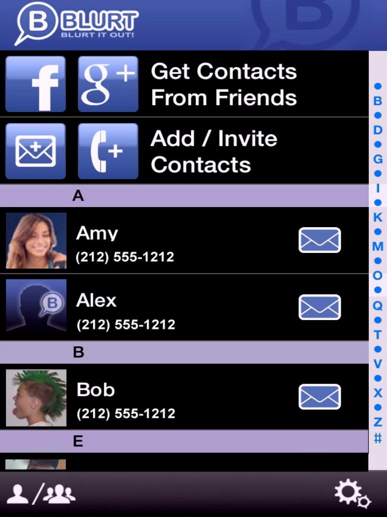 * Get help by tapping the ( i ) buttons on the upper right corner of each screen * Popups let users know when their friends join Blurt * Tapping BLURTstream icons play incoming Blurts automatically * Add users to your Blurt Contacts list by tapping on the green "+" icons * Links to Facebook and Google + allow adding those friends as Blurt contacts * Push Notifications alert users to arriving Blurts when the app is closed * A healthy spraying of eco-friendly insecticide removed lingering bugs
