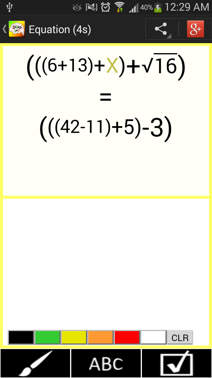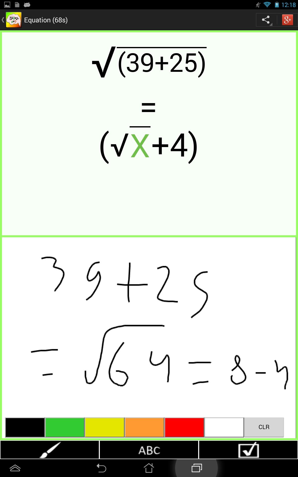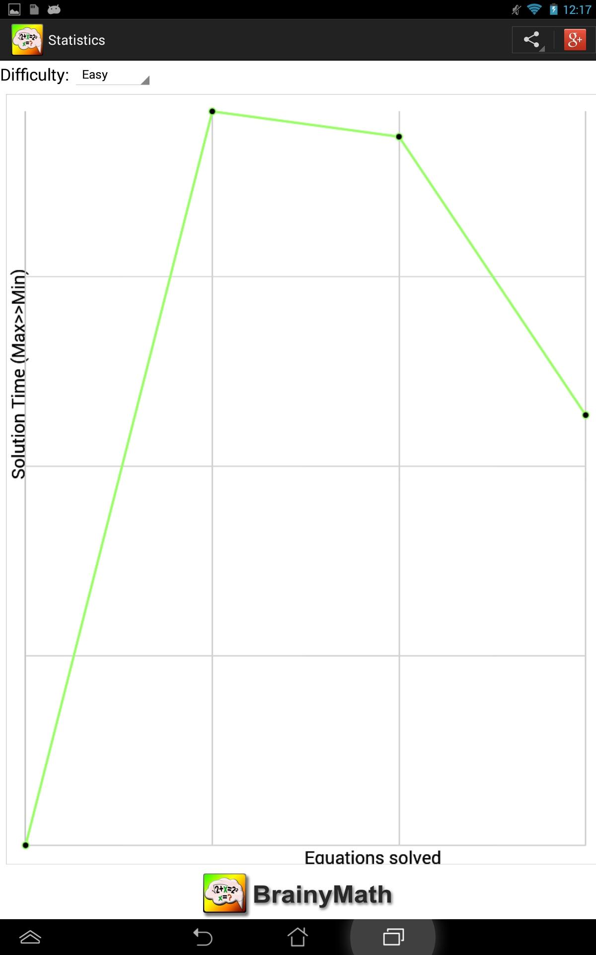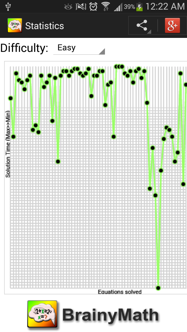 Practice solving equation and challenge yourself to the limit of your abilities. Brainy Math lets you try equations of various difficulties. All can be solved without a calculator. You have to solve for variable X. Equations include operations such as addition, subtraction, multiplication, division, exponents, and square roots. While solving the equation you can draw or type out rough work to reach the solution. Once ready you just type the answer. After you can see if you were correct or wrong. You can then view the step by step instructions for correct solution. Results and time for each attempted problem are stored so that you can view your progress from the statistics page with graphical representation of your improvements over time. Complete achievements, share your results with your friends and have fun!