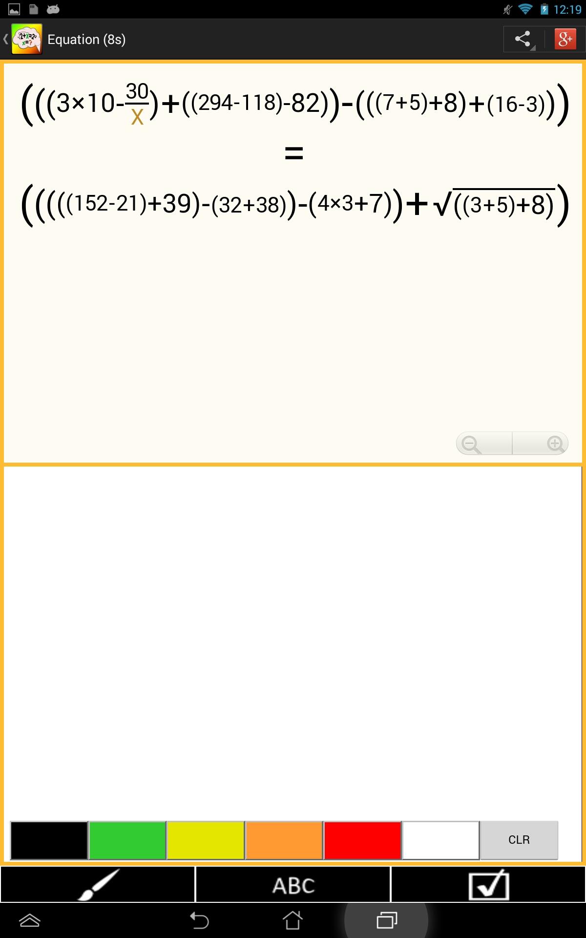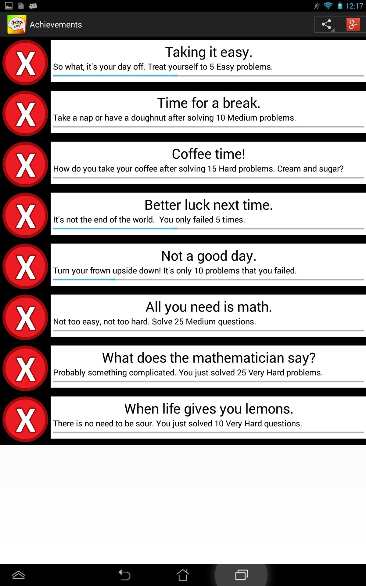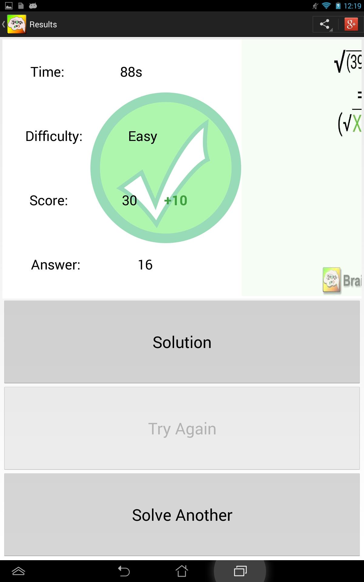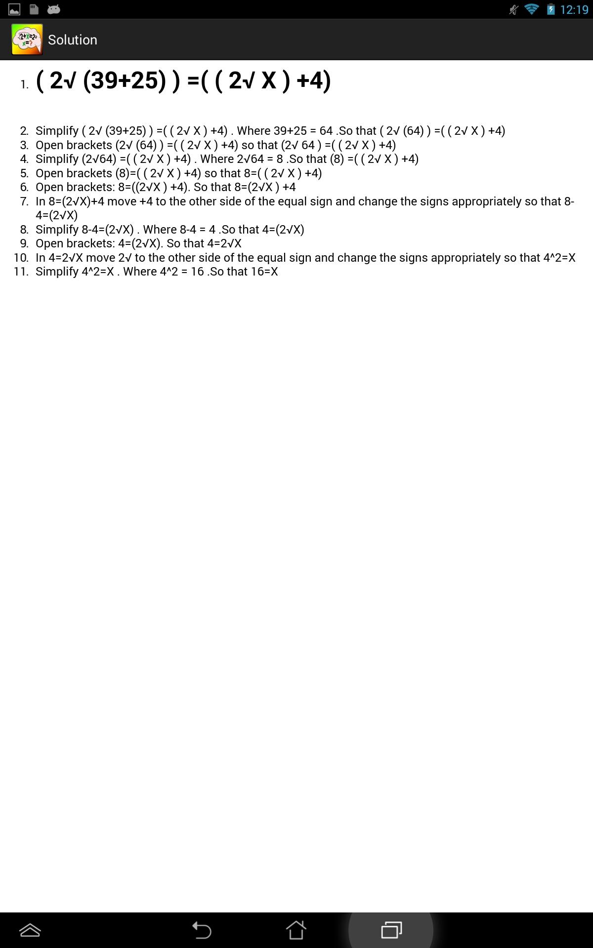 Practice solving equation and challenge yourself to the limit of your abilities. Brainy Math lets you try equations of various difficulties. All can be solved without a calculator. You have to solve for variable X. Equations include operations such as addition, subtraction, multiplication, division, exponents, and square roots. While solving the equation you can draw or type out rough work to reach the solution. Once ready you just type the answer. After you can see if you were correct or wrong. You can then view the step by step instructions for correct solution. Results and time for each attempted problem are stored so that you can view your progress from the statistics page with graphical representation of your improvements over time. Complete achievements, share your results with your friends and have fun!