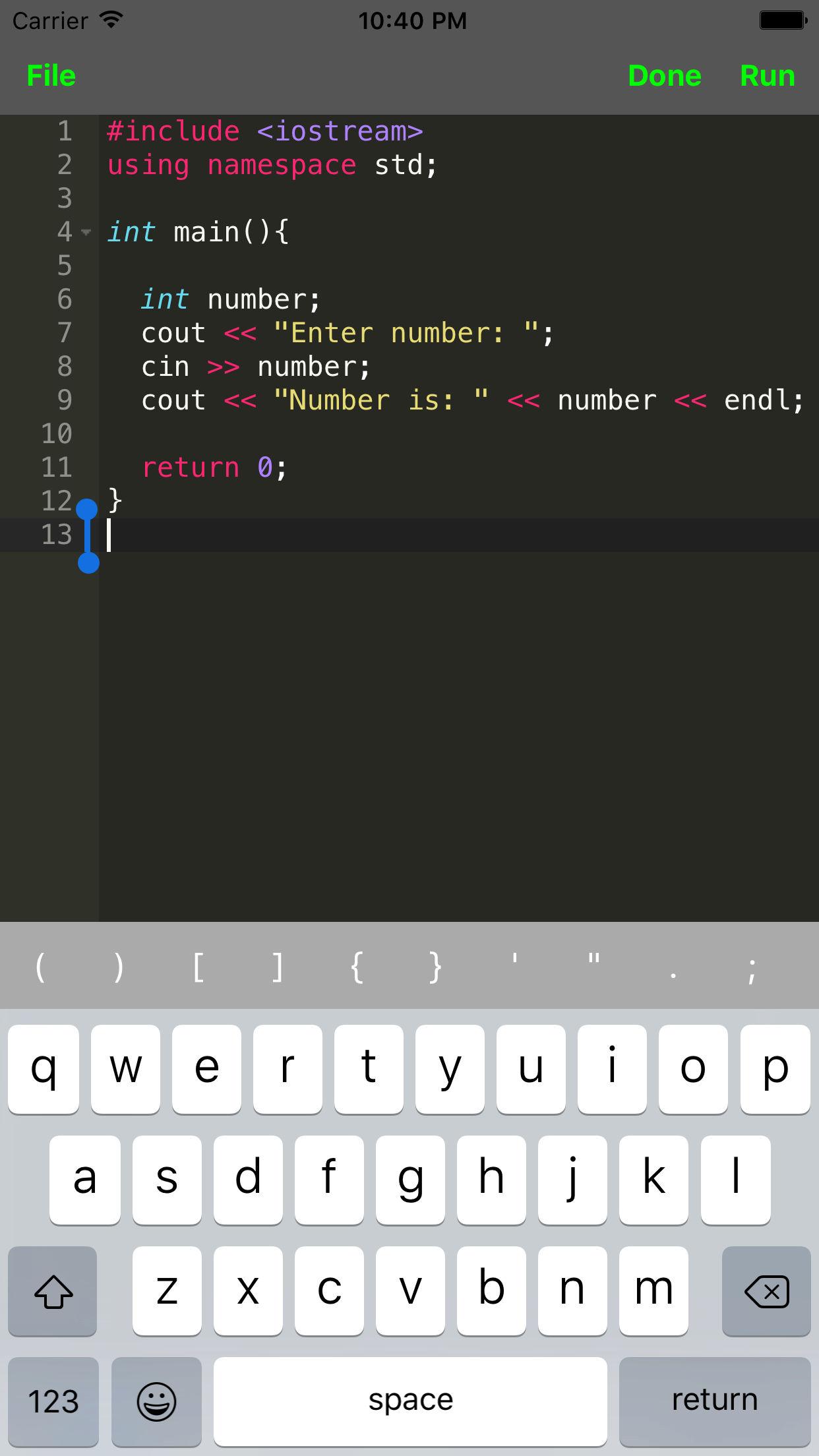 Write C/C++ code directly on your Android devices! This app is ideal for learning and testing code snippets! Features: - Compile and run your program - View program output or detailed error - Advanced source code editor with syntax highlighting, code completion and line numbers - Language reference Limitations: - Internet compilation is required for compilation - File system, network and graphics functions are not supported - Maximum program running time is 15s