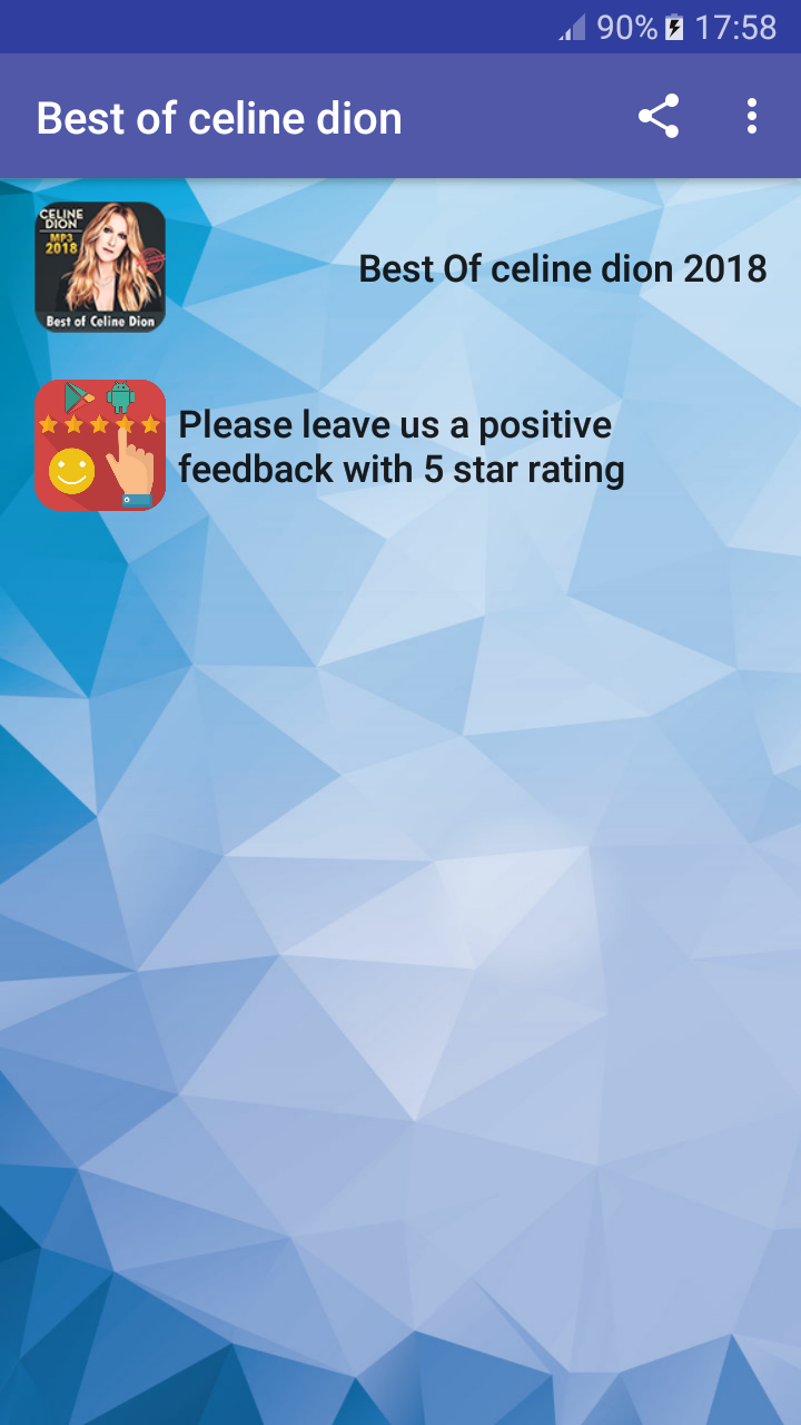 Best of celine dion(包名:com.bestmusic.celinedion)開發者是INTJ App,Best of celine dion的最新版本1.0更新時間為2018年05月04日。Celine Dion 2018 Mp3的分類是音樂與音效。您可以查看Celine Dion 2018 Mp3的開發者下的所有應用。目前這個應用免費。該應用可以從APKFab或Google Play下載到Android 4.1+。APKFab.com的所有APK/XAPK文檔都是原始文檔並且100%安全下載的資源。