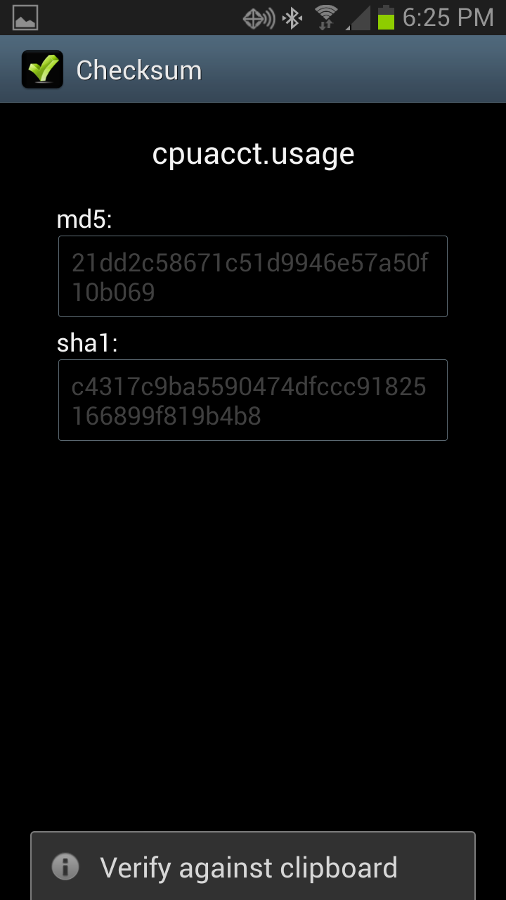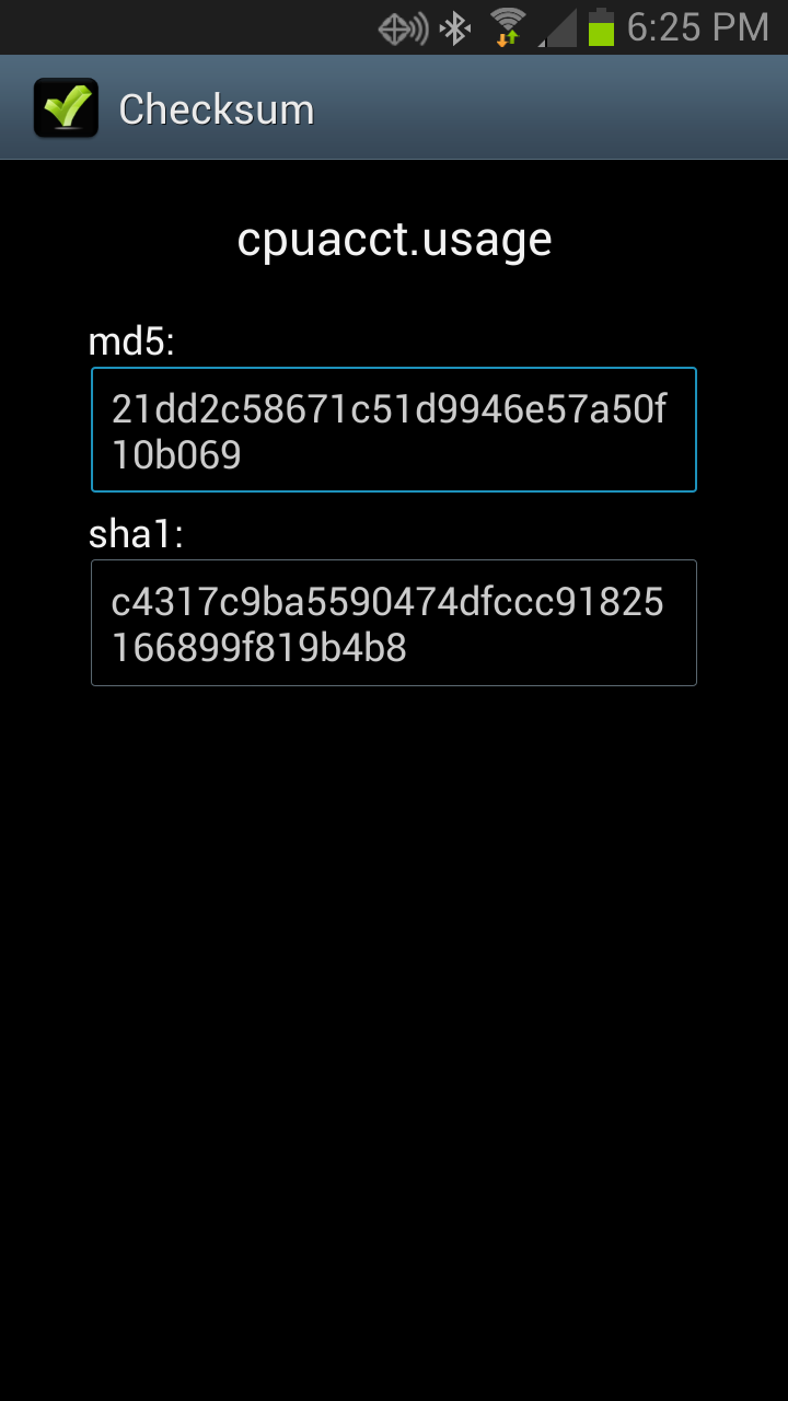 v1.3 - Bug Fix: Double clicking the text areas will now copy md5/sha1 to clip board on newer android devices.