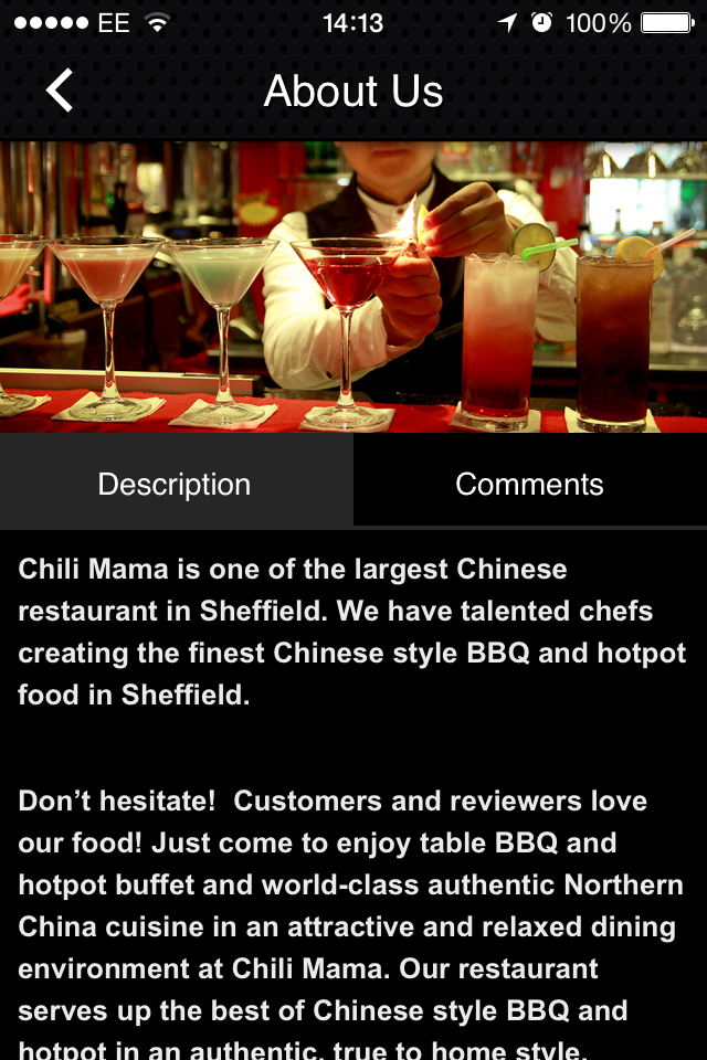 Chilli Mama is one of the largest Chinese restaurants in Sheffield. Chilli Mama's talented chefs create the traditional and authentic Northern China style BBQ and hotpot food. Download the Chilli Mama Android App for full access including: - Restaurant location and GPS Directions - Menus (BBQ Buffet, Set Menus and Signature Dishes) - Table Reservations - Loyalty Scheme - Image Gallery - Special Offers and Updates - Opening Hours. This is a free app to download.