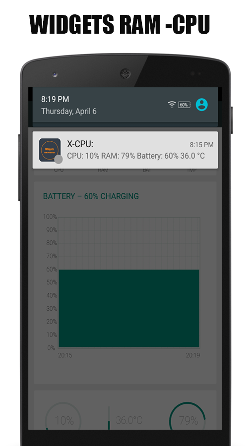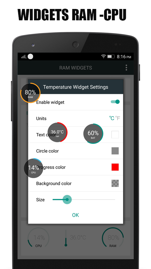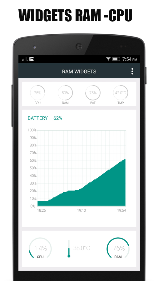 CPU RAM - Widgets Show Widgets of various CPU RAM BAT TEMP functions. Display Widgets of CPU RAM BAT TEMP work to see clearly up, you can choose to adjust the size of the back of the user's needs.