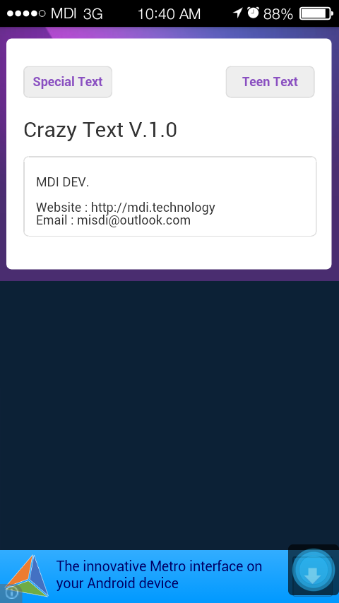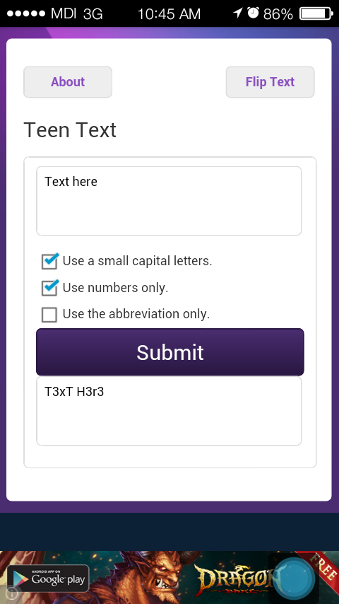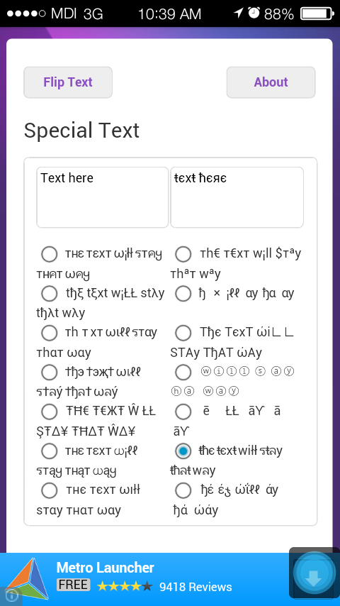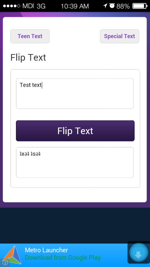 Crazy Text is a simple application that can convert plain text into the flip text, teen text and special text. With Flip Text you can change every letter to flipped text like "ʇxǝʇ ɹnoʎ dılɟ". Teen text can transform text to small capital letters, numbers only or the abbreviation only. and then special text can convert text to other style text. Ho to use : Follow these steps. 1. Enter your text into the first box 2. Copy the upside down text from the boxes and paste where you want tag :Flip text, crazy text, transform text