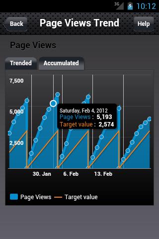 Have your website key performance indicators (KPIs) always with you on your Smartphone and all at one glance! Using your Google Analytics account this application shows the most important web analytics metrics of your website on one single dashboard. You won't have all the Google Analytics metrics on your Phone - but the ones the are important from a management point of view. In addition, a 'Performance Index' is automatically calculated, that shows your website performance today, this week and this month in one single number. Even more, the index is indicating in red or green whether your website is on track or not. The following features are available -Have your five most important Google Analytics key performance indicators on your Phone (total goal conversions, total goal values, visitors, visits and page views). -Define target values for each KPI (e.g. 1000 visits per day) -See how you're on track reaching your target KPI values for today, this week and this month -Weight a KPI regarding its importance compared to the other ones (e.g. a conversion shall be 50 times more important than a visit) -Let the application calculate a performance index based on the selected KPIs, their weighting and progress in reaching the defined target values -See all that on one dashboard page -See charts for each of your performance indicator (including target values) in a trended and accumulated view -Access several Google Analytics accounts and profiles These are additional features that are not available in Google Analytics, but make it very convient for a management person to always keep the current website performance in view. A Google Analytics account is required for using the dashboard. IMPORTANT LOGIN NOTICE: If you are using Google's 2-step verification process (e.g. via SMS), an application-specific password needs to be setup in your Google Account settings. Please see http://goo.gl/zn584 for details.