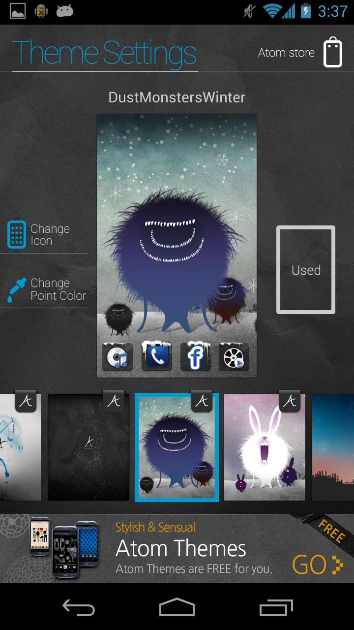 *** Features - High quality : Launcher for Ice Cream Sandwich / Jellybean (from Android ICS/JB 4.0.2) - Light & Easy : Offers Select Options by light and easy launcher - Stylish : Stylish UI with backgrounds, icons, and points colors - Smart : Optimized themes for ICS, Automatically supporting existing launcher such as SSKIN and Go Launcher - Fun: Offers fun-interactive themes by various backgrounds, live backgrounds and ICS’s widgets *** Atom Launcher Spec. - Supports for ICS’s widgets and menu: Widgets located on upper side of screen (search bar or clock) - Available for Changing Display Settings on Hidden Dock: Emotional Filter Effect, Various Screen Switching, Opacity Adjustment - Available for Changes by Setting Point Color Changes: Available for Color Changes for widgets, Menu, Guide, or icons - Live Background: Changes to dull backgrounds with dynamic backgrounds - Wide-Range Theme Support: Wide-range theme support by Atom Launcher and also existing SSKIN and GO Launcher themes - Badge: Display missed call, unread message (Supprots only defalt apps on your Android device, Could not support the funtion by devices) *** Attention - Available from above Android OS 4.0.2 version - The application needs 10 MB in total to save theme resources. - Because of enhancing usability, installed theme doesn’t appear - Not Available for Tab Device (X-large screen) *** Customer Support Please leave reviews or comments on Google play reviews Your review will be appreciated. For more information or support, please visit - Facebook: http://www.facebook.com/atom.themes