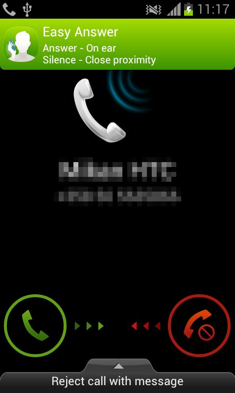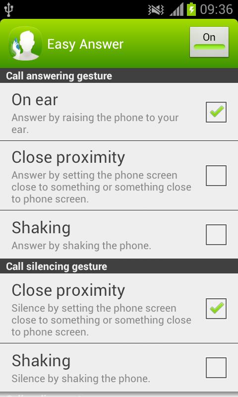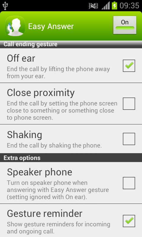 Easy Answer - Answer your calls without touching the screen or even the phone! Easy Answer allows you to answer and silence incoming calls, as well as end the ongoing call without touching the screen. Optionally, you can set speaker to be enabled automatically when answering the call with Easy Answer gesture. This all becomes handy when you have dirty hands, you are wearing gloves or you are otherwise unable or unwilling to touch the screen. Easy Answer is also easy to switch off when not needed - no uninstallation is required and selected gestures remain selected until Easy Answer is turned back on next time. You can e.g. answer just by raising the phone to your ear (requires choosing "On ear" as answering gesture) and end the call just by lifting the phone away from your ear (requires choosing "Off ear" as ending gesture). Or if you want to silence the ringing, just put your hand close to the screen, slide your hand across the phone screen without touching it or flip the phone over if it is on the table (all the listed silencing gestures require choosing "Close proximity" as silencing gesture). If your phone usually lays on the table and you prefer using the speaker, just enable the speaker from Easy Answer options and then answer and end the call by putting your hand close to the screen e.g. slide your hand across the phone screen without touching it (requires choosing "Close proximity" as answering and ending gesture). These same settings can be handy also when e.g. driving the car with the phone in its holder. Be careful not to end the call by accident with the call ending gestures "Off ear" and "Close proximity" e.g. lifting phone away from ear even for a moment when using "Off ear" or flipping the phone when using "Close proximity". Notice: Easy Answer has not been tested on Android 4.1 (Jelly Bean) or newer operating system versions, and therefore may not work on such devices. Notice: Easy Answer may not work properly together with other similar applications or with some of the (microphone) headsets or similar accessories.