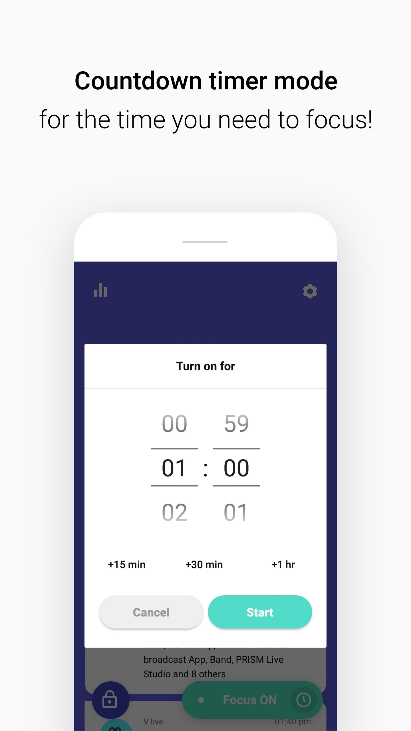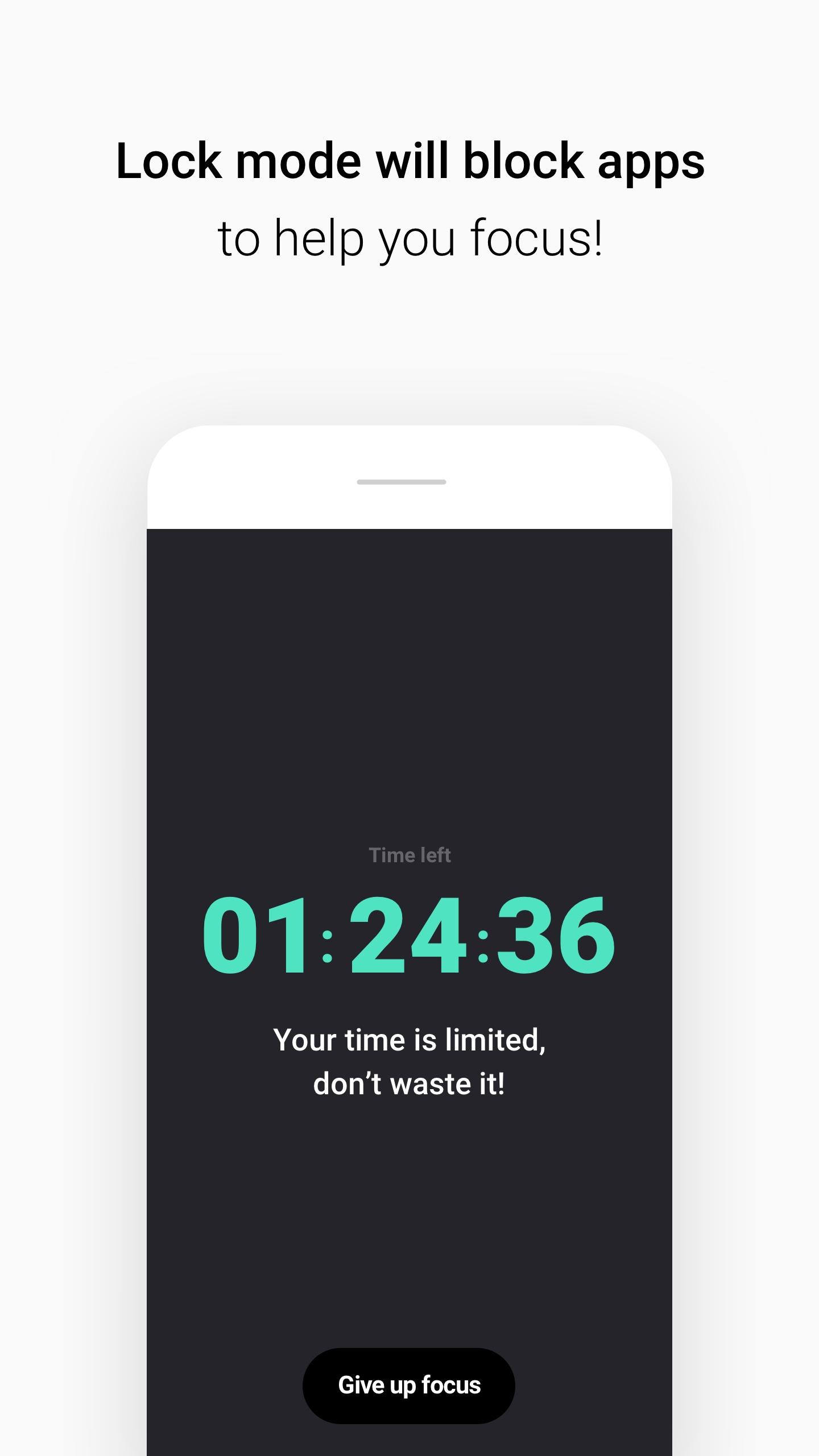 When lock mode is turned on, Focusbot will block apps so you can better focus. You wouldn't be able to use any app during the time you set.