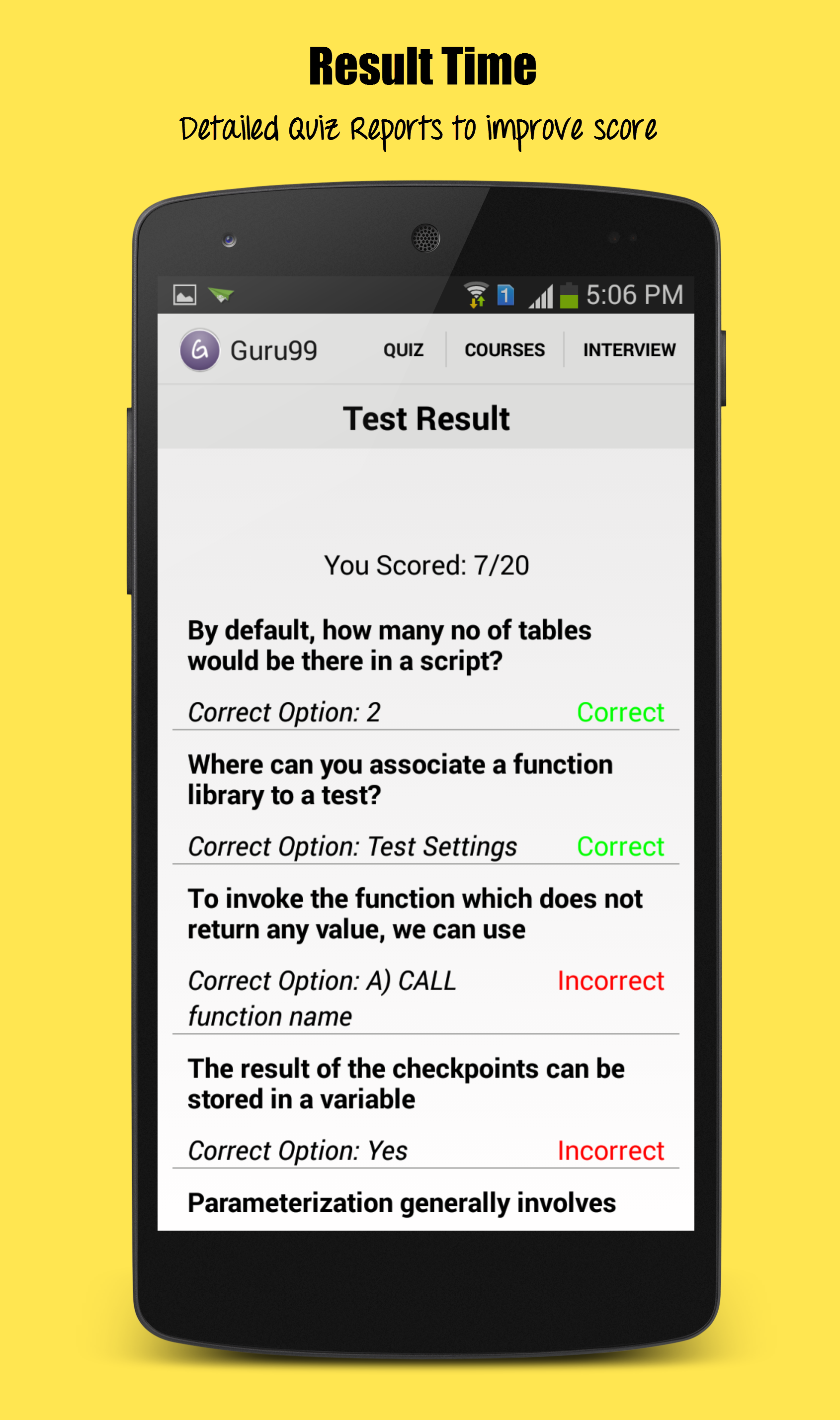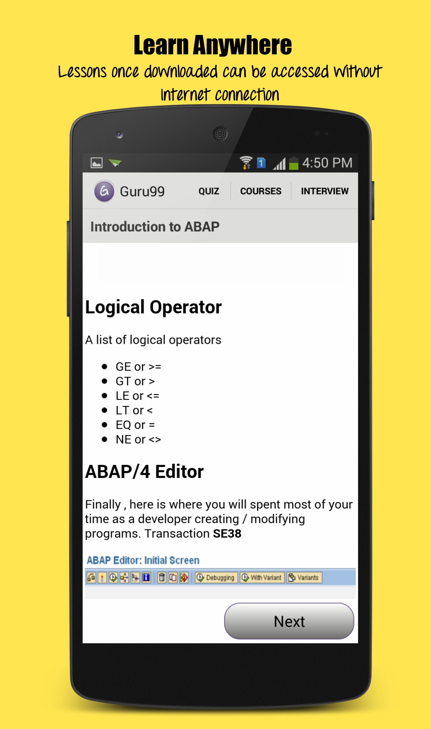 Learning new courses on the go has never been so easy! Guru99’s one of thetop-rated education app instantly shows you various courses that you always wanted to learn. The free Guru99 Android app provides video and text based tutorials for different technical & non-technical topics. You can also take QUIZ to test your newly acquired knowledge. “One of the best Android apps for learning new courses." – Best Android Apps Review The app now has a detailed Interview Section to help you win a Job List of Courses you can learn (more courses added every week) - = Introduction to Manual Testing = Automation with QTP (Quick Test Professional) = Performance Testing with Loadrunner & Jmeter = Test Management with Quality Center = Database with SQL = Java & ABAP Programming = Introduction To SAP = SAP HR = SAP SD = SAP MM = SAP CRM = SAP HCM = SAP FICO = SAP Basis We'd love to hear your feedback! Email us anytime: [email protected]