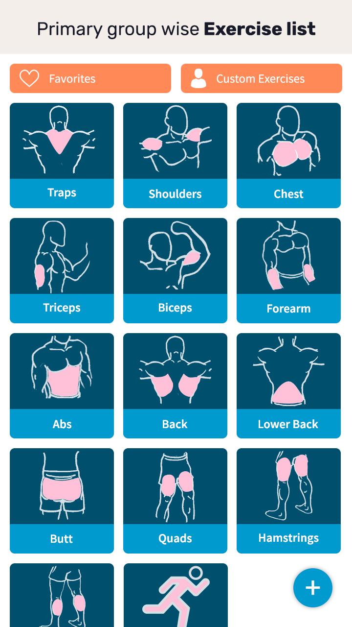 Abs, Back, Biceps, Butt, Calves, Cardio, Chest, Forearm, Hamstrings, Lower Back, Quads, Shoulders, Traps and Triceps.