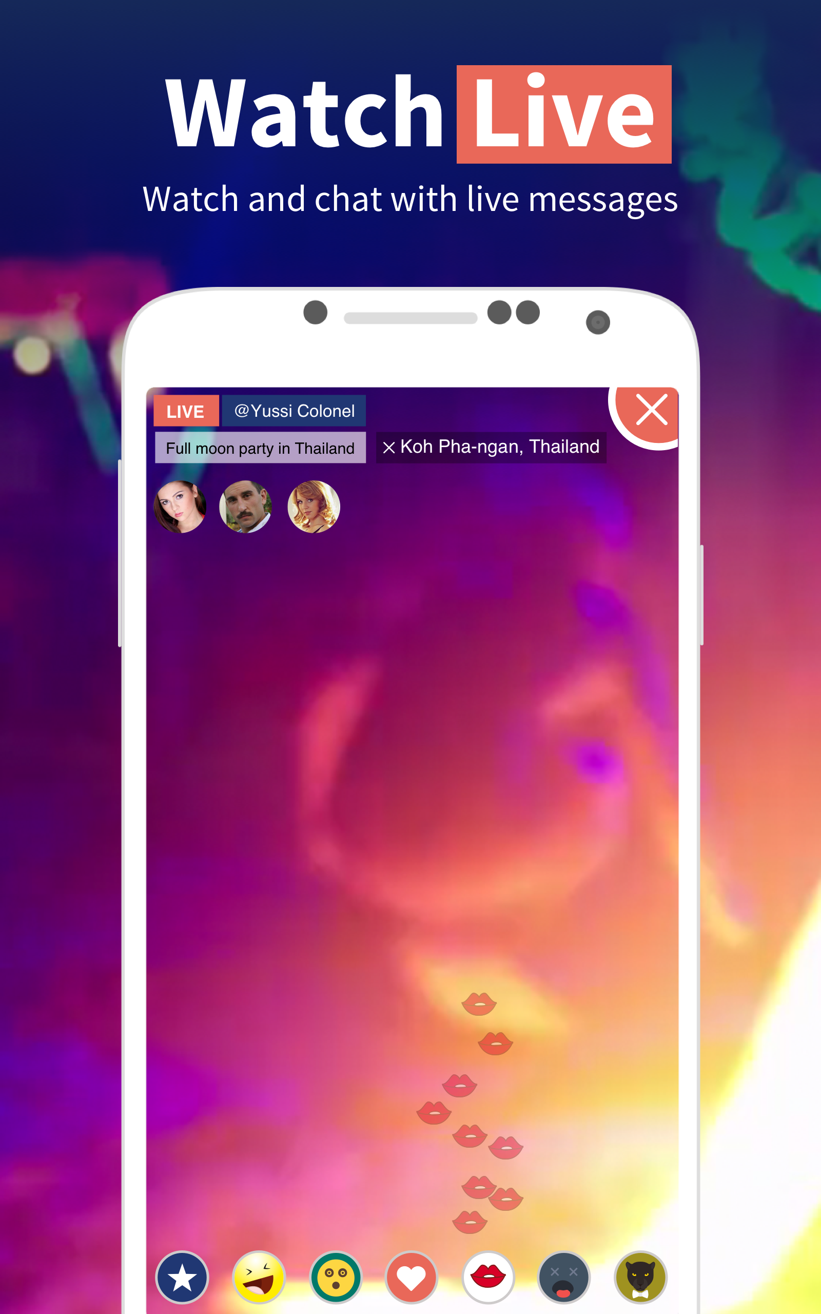 Share your emotions with the ready-made 7 Emotions feature. Single tap or long hold, share your likes, moods and excitements with the live broadcaster or watchers. This is only available to streamings through Iboga's Discover channel.