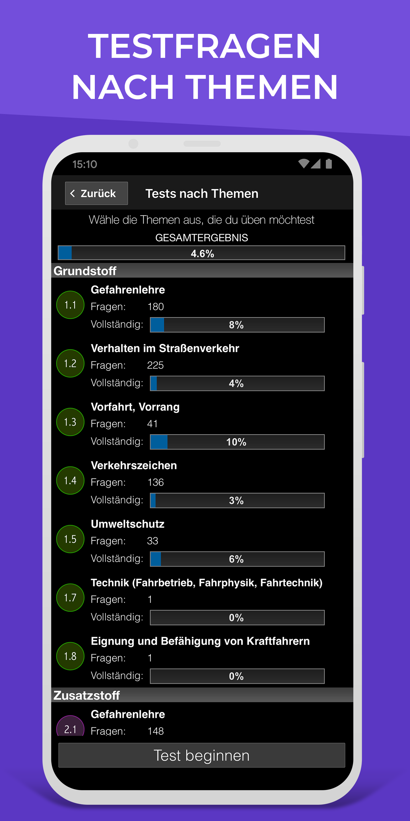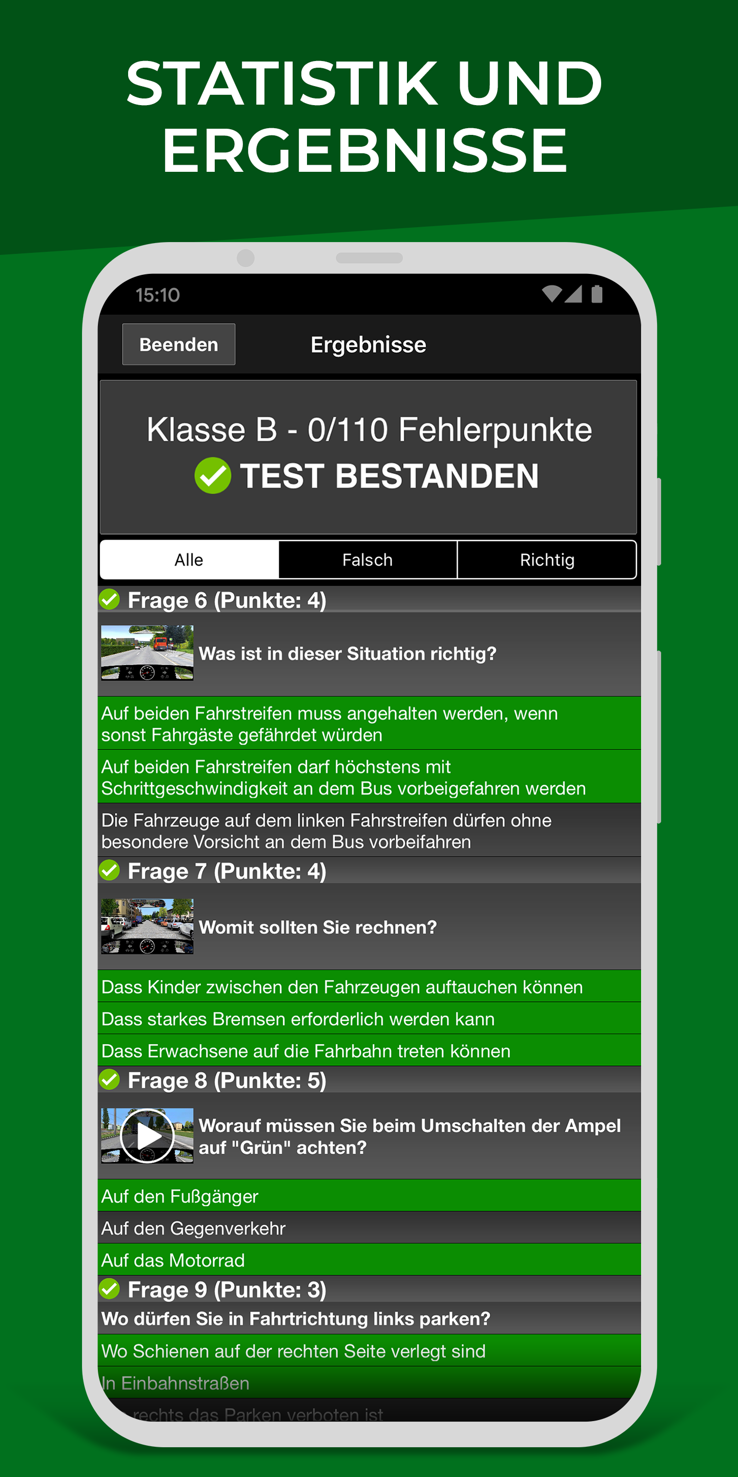 - 統計數據和結果駕訓班應用程式保存了駕照理論所有考試和個別題目的成績。這樣可以創建最佳統計數據,並且您可以在學習駕駛時隨時檢查您的知識水平。