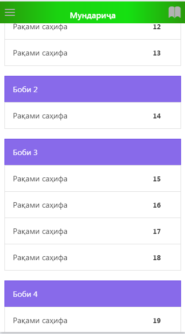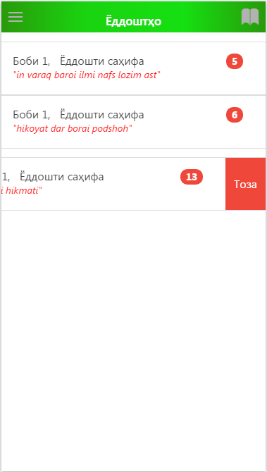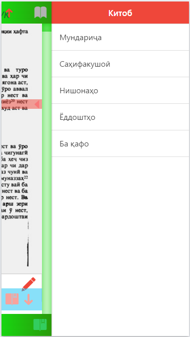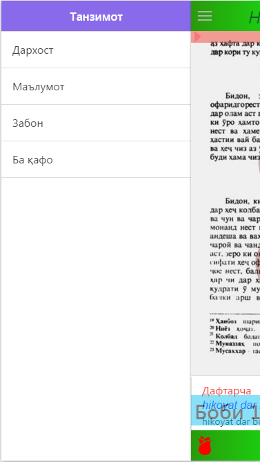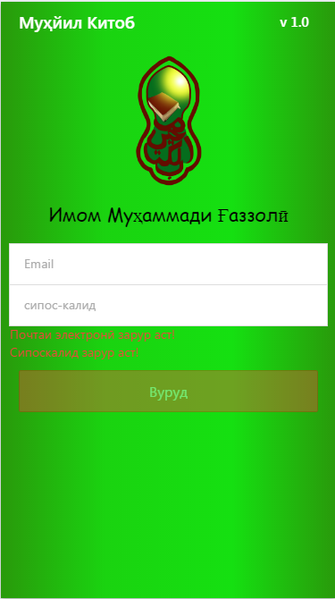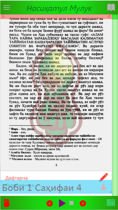 (ДИҚҚАТ: Акнун, ин китоб пурра барои компютер ва барои андроид дар шакли диск, дар мағозаҳои дискфурушии ш. Душанбе бо нархи арзон фурухта мешавад !!!) YouTube: https://youtu.be/9xSNpfZ7gD8 (NOTE: for changing language to engish go to left menu->забон->english ) Sipos has released audio book products in the form of mobile,tab, computer applications. This is the demo for Nasihat-ul-Muluk of Imam Muhammad Ghazali (R.A.). Muhyil Kitob is the API for these applications which handles audio books. Be free to contact us! The app is in 4 languages russian, english, farsi, tajik. (NOTE: for changing language to russian go to left_menu->забон->руский ) Сипос выпустил аудио-книги продукты в виде мобильного, планшетных, компьютерных приложений. Это демо-версию для Насихат-уль-Мулука имама Мухаммада Газали (РА). Muhyil Китоб является API для этих приложений, которые обрабатывает аудио-книги. Вы свободно можете обратиться к нам! Это приложение на 4 языках русский, английский, фарси, таджикском.