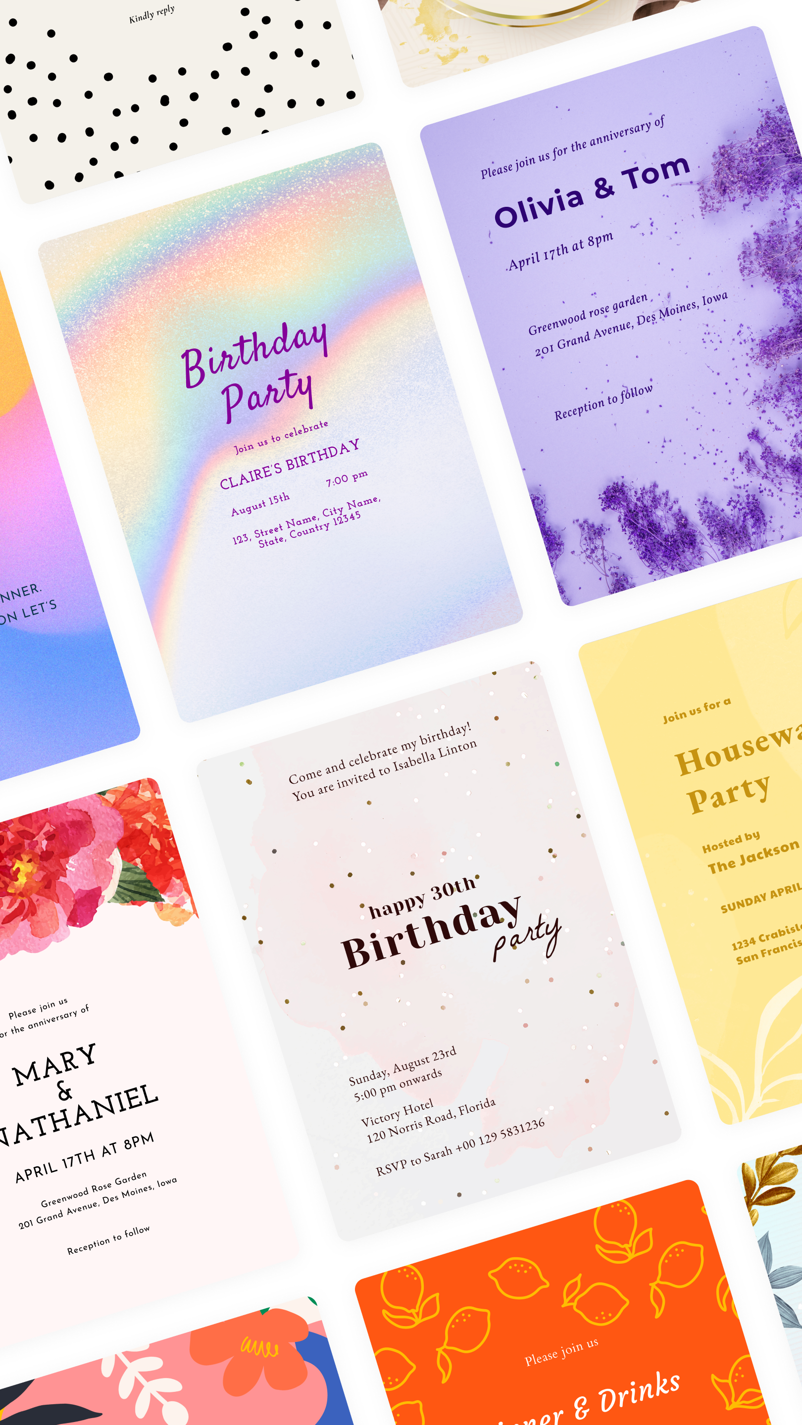 選擇一個邀請模板,添加您的自定義措辭、活動詳細信息和照片。讓它獨特而難忘!