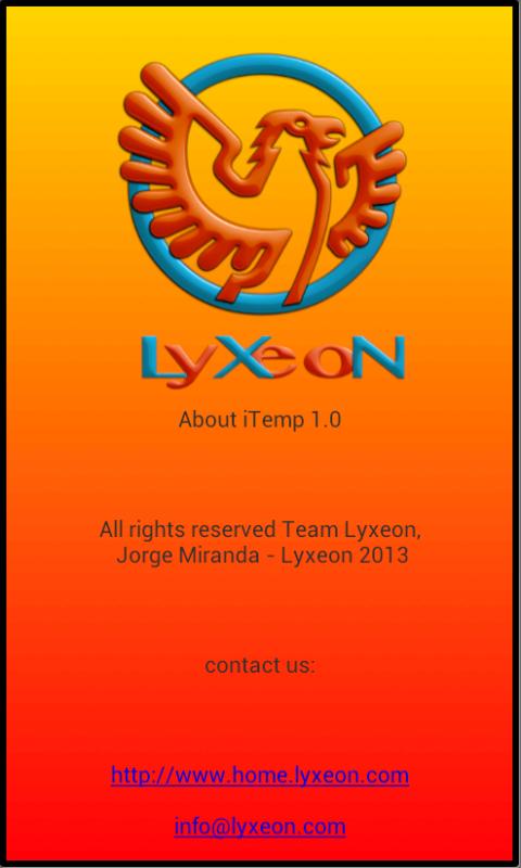 iTemp mini(包名:com.lyxeon.itemp)開發者是LyXeoN Dev Team,iTemp mini的最新版本1.0.4更新時間為2013年04月09日。iTemp mini的分類是天氣。您可以查看iTemp mini的開發者下的所有應用。目前這個應用免費。該應用可以從APKFab或Google Play下載到Android 2.3.4+。APKFab.com的所有APK/XAPK文檔都是原始文檔並且100%安全下載的資源。
