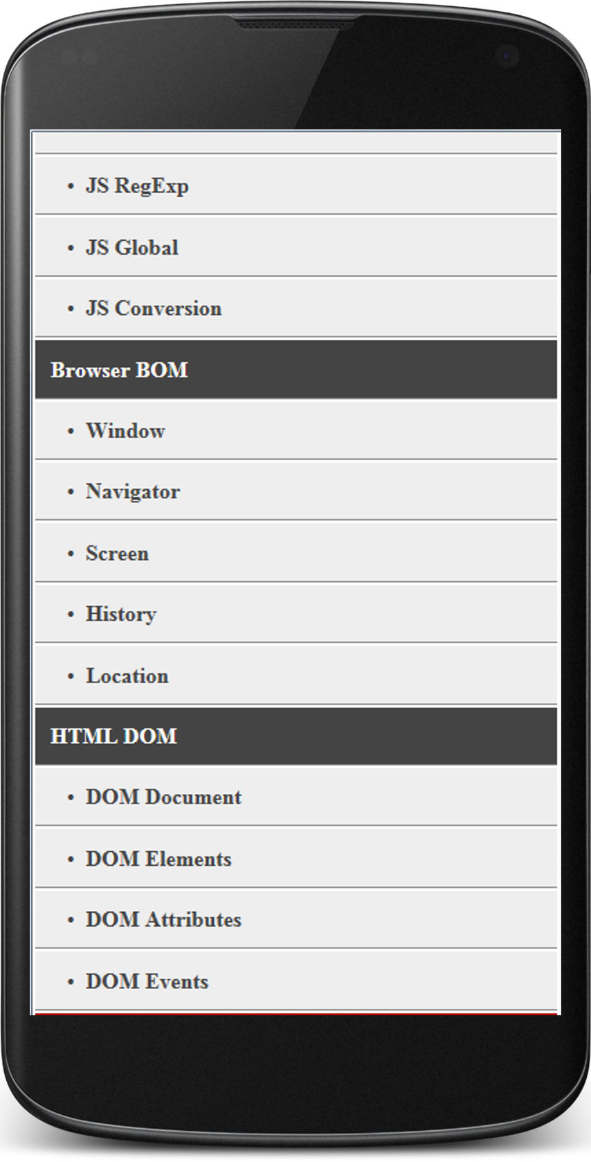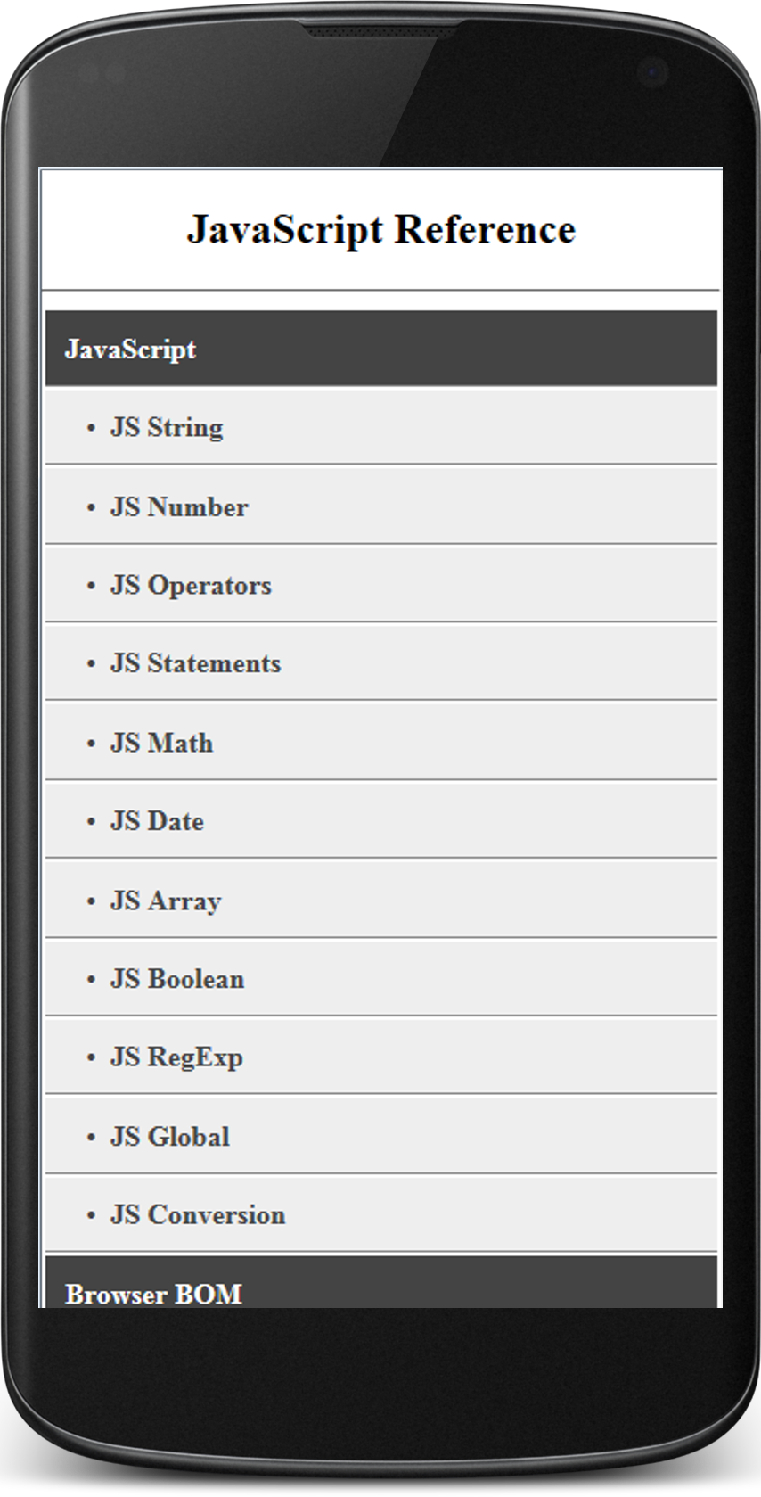 The Complete JavaScript Reference with full of Examples. JavaScript - JS String - JS Number - JS Operators - JS Statements - JS Math - JS Date - JS Array - JS Boolean - JS RegExp - JS Global - JS Conversion Browser BOM - Window - Navigator - Screen - History - Location HTML DOM - DOM Document - DOM Elements - DOM Attributes - DOM Events
