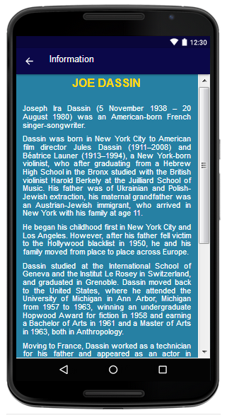 Music gives its own color in your life. Music is part of the work of art that can not be separated from our daily life. The song of Joe Dassin gives you a unique feel in your life. You can enjoy Mp3 Music Joe Dassin wherever you are. Mp3 Songs Joe Dassin's song is complete with lyrics so you can sing along while the song is on the play and complete your happiness in enjoying streaming songs that are available in this app. This app is not owned by the artist, it was created by fans for Joe Dassin fans. This apikasi Feature: Songs, Lyrics, Profiles, and more from Joe Dassin. Song of Joe Dassin: -Et si tu n'existais pas -Les Champs-Élysées -L'Eté Indien -Siffler sur la colline -Ça va pas changer le monde -Salut les amoureux -À toi -Salut -Il était une fois nous deux -Dans les yeux d'Émilie -Cécilia -Guantanamera -L'Amérique -Côté banjo, côté violon -Le Chemin de papaJoe Dassin - Song and Lyrics 15 songs from Joe Dassin best to be heard Music gives its own color in your life. Music is part of the work of art that can not be separated from our daily life. The song of Joe Dassin gives you a unique feel in your life. You can enjoy Mp3 Music Joe Dassin wherever you are. Mp3 Songs Joe Dassin's song is complete with lyrics so you can sing along while the song is on the play and complete your happiness in enjoying streaming songs that are available in this app. This app is not owned by the artist, it was created by fans for Joe Dassin fans. This apikasi Feature: Songs, Lyrics, Profiles, and more from Joe Dassin. Song of Joe Dassin: -Et si tu n'existais pas -Les Champs-Élysées -L'Eté Indien -Siffler sur la colline -Ça va pas changer le monde -Salut les amoureux -À toi -Salut -Il était une fois nous deux -Dans les yeux d'Émilie -Cécilia -Guantanamera -L'Amérique -Côté banjo, côté violon -Le Chemin de papa Please support the musicians by purchasing concert tickets, CDs, vinyl and original merchandises. Enjoy this all my friends! Please support the musicians by purchasing concert tickets, CDs, vinyl and original merchandises. Enjoy this all my friends!