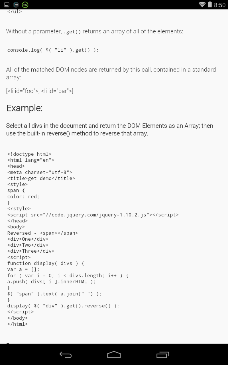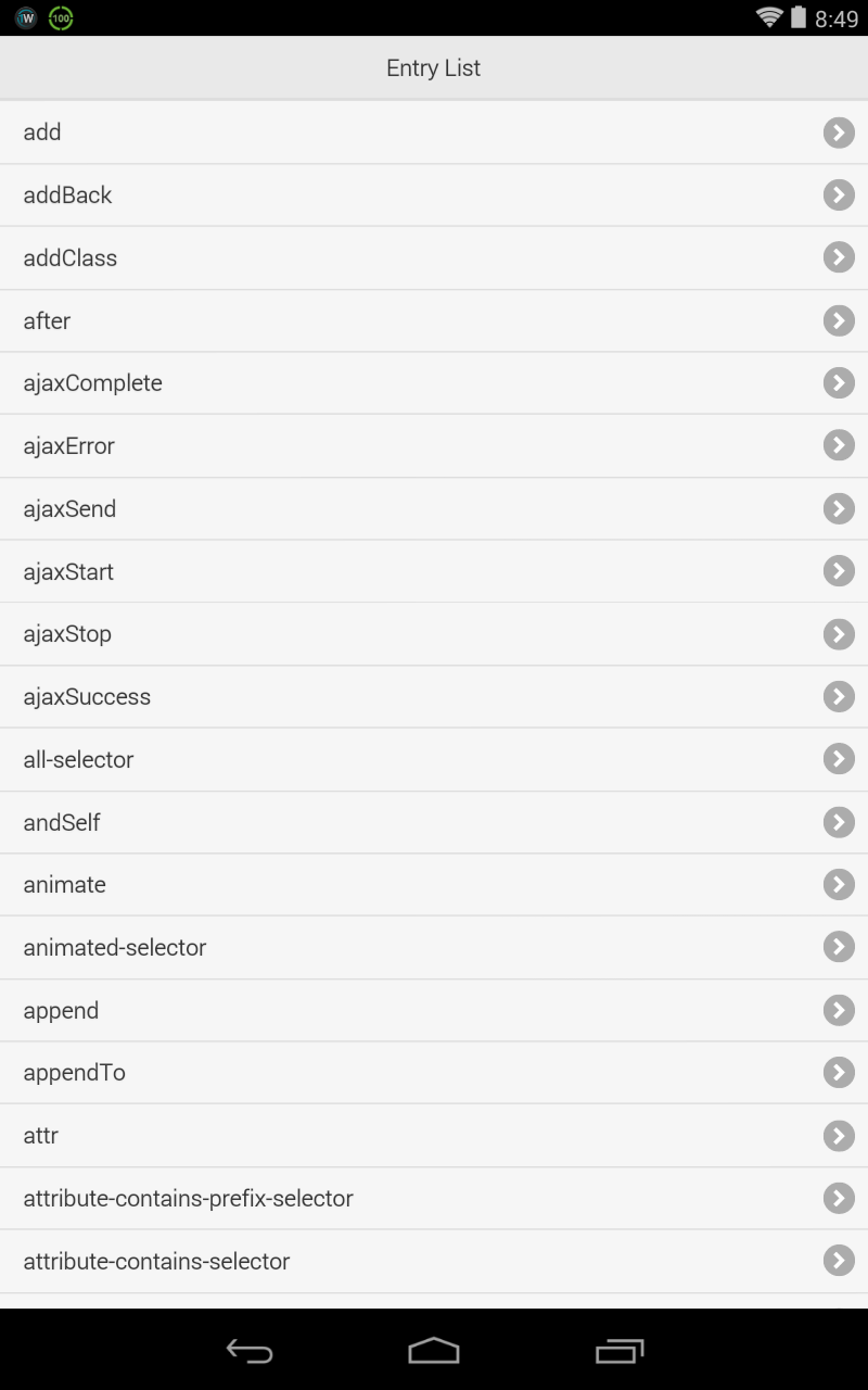 This app will provide you with quick and easy access to the documentation for jQuery version 1.11.1. You can navigate the entries alphabetically and filter search the entries also. I will aim to provide monthly updates to the contents as the jQuery team release them. This app is not produced by the jQuery team, the contents contained within are. Please send any feedback to [email protected], good or bad would be much appreciated. THE SOFTWARE IS PROVIDED "AS IS", WITHOUT WARRANTY OF ANY KIND, EXPRESS OR IMPLIED, INCLUDING BUT NOT LIMITED TO THE WARRANTIES OF MERCHANTABILITY, FITNESS FOR A PARTICULAR PURPOSE AND NONINFRINGEMENT. IN NO EVENT SHALL THE AUTHORS OR COPYRIGHT HOLDERS BE LIABLE FOR ANY CLAIM, DAMAGES OR OTHER LIABILITY, WHETHER IN AN ACTION OF CONTRACT, TORT OR OTHERWISE, ARISING FROM, OUT OF OR IN CONNECTION WITH THE SOFTWARE OR THE USE OR OTHER DEALINGS IN THE SOFTWARE.