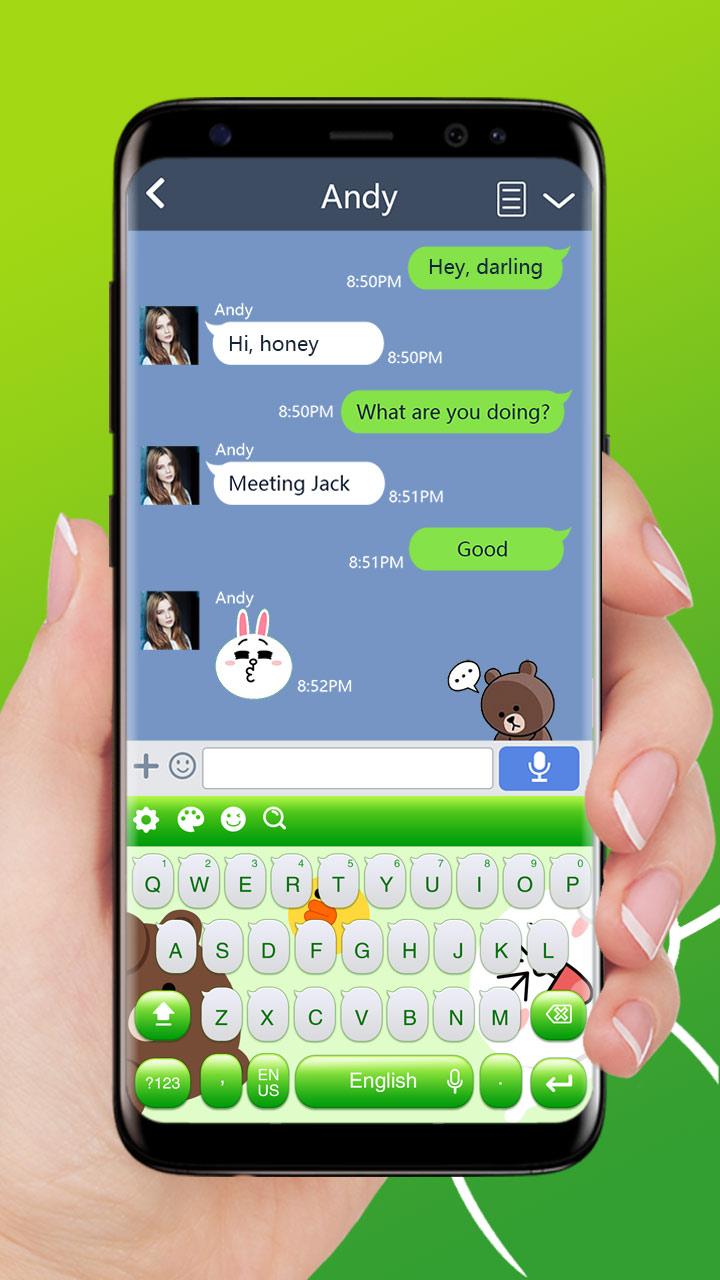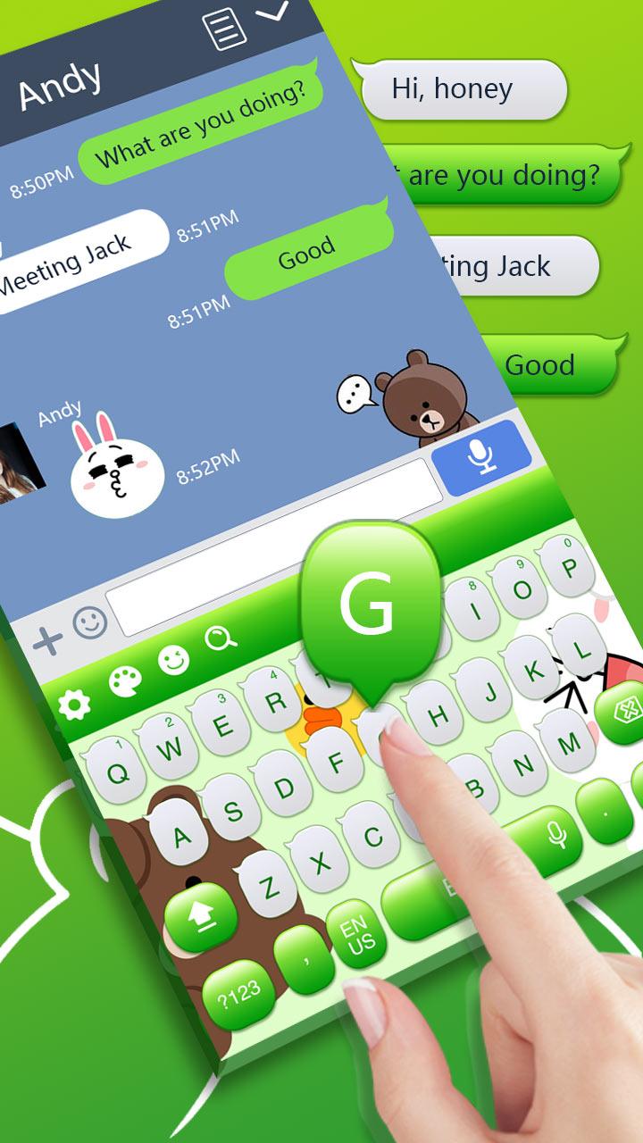 This is a set of keyboard theme for LIN themes. Start a new typing style and try a different keyboard. It consists of not only cartoon element, but also chat. The combination of these elements makes these keyboard theme for LIN themes more distinguished and personalized. Characteristics: This set of themes are characterized by the following: 1. Both cartoon and chat elements are presented. 2. Setting green as the background color. This green color serves as a perfect background to make the feature of cartoon and chat elements stand out in these keyboard theme for LIN themes. 3. linefrends element has been applied to highlight the characteristics of keyboard theme for LIN theme. How to download these keyboard theme for LIN themes? To download this set of keyboard theme for LIN themes, you need to download and apply our input method APK. With that installed, you can then enjoy these unique keyboard theme for LIN themes. More benefits for downloading these themes: 1. Cloud Prediction function at hand: typing more efficiently with cloud data powered prediction function to accurately predict your input. 2. Gesture Typing: instead of typing one letter a time, just swipe through letters to enjoy easier typing. 3. GIFs: huge amount of funny GIF images. Typing can be fun. 4. Thousands of themes: themes of various styles including cute, cool, tech and luxury ones, etc. There is always one for you. 5. Clipboard function available: cut your input for a quick paste, fast and convenient. Thanks for using our themes. You can show your favor and support by giving great ratings. Thanks!