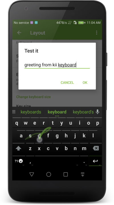 Kii Keyboard 2 is an alternative keyboard on Google Android. It’s the successor of the original popular Kii Keyboard, love by millions of users. Kii Keyboard 2 is free to use. Our goal is to create the best keyboard app for both Android phones and tablets. Features Kii Keyboard 2 is currently in active development and beta testing, all features are completely free to use. Emoji Keyboard: support messaging emoji to ios and android Best all-in one keyboard optimized for both phone and tablets Accurate and smart keyboard predictions User defined text shortcuts Extra number key row Extra arrow key row Next word prediction Gesture keyboard control Gesture input Split keyboard layouts Support many keyboard layouts: PC, Compact qwerty, T9, Dvorak, Azerty, Colemak 6 build-in HD themes Support a variety of themes types: Go Keyboard theme, iKeyboard & Kika keyboard theme, Themeshop keyboard theme, CM10 themes Font and color customization Use any pictures as keyboard background True Multi-touch keyboard Based on the latest Android Nougat AOSP keyboard ●Support many languages: ☆English keyboard ☆Arabic - لوحة المفاتيح العربية ☆Czech - čeština klávesnice ☆Danish - dansk ☆German - Deutsch Tastatur ☆Spanish - Español teclado ☆Greek - Ἑλληνική πληκτρολόγιο ☆Estonian - Estonian klaviatuur ☆Finnish - Suomi näppäimistö ☆French - française clavier ☆Croatian - Hrvatski tastatura ☆Hungarian - Magyar billentyűzet ☆Icelandic - Icelandic hljómborð ☆Italian - Italiano tastiera ☆Georgian -ქართული კლავიატურის ☆Lithuanian -Lietuvių ☆Latvian - latviešu klaviatūra ☆Norwegian (Bokmal) - Norsk (bokmål) tastaturet ☆Dutch - Nederlands toetsenbord ☆Portuguese (Brazil) -português teclado ☆Portuguese (Portugal) -português teclado ☆Polish - polski klawiatura ☆Russian -Русский клавиатура ☆Romanian - română claviatură ☆Slovak - Slovenčina klávesnice ☆Slovenian -slovenščina tipkovnico ☆Serbian -српски тастатура ☆Swedish - svenska tangentbord ☆Turkish - Türkçe klavye ☆Ukrainian -українська клавіатура ☆Hebrew - מקלדת בעברית