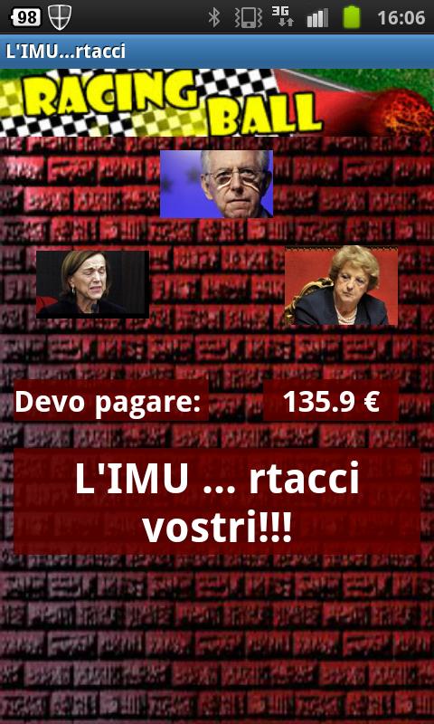 Applicazione che simula (ma non troppo) il calcolo dell'IMU, la nuova tassa sulla casa istituita dal governo Monti. L'Applicazione vuole essere solo un modo scherzoso di manifestare il mio dissenso a questo ennesimo balzello e non vuole istigare ad alcun comportamento illegale.