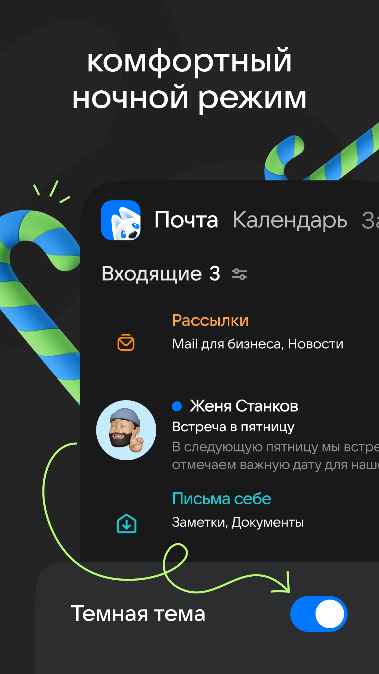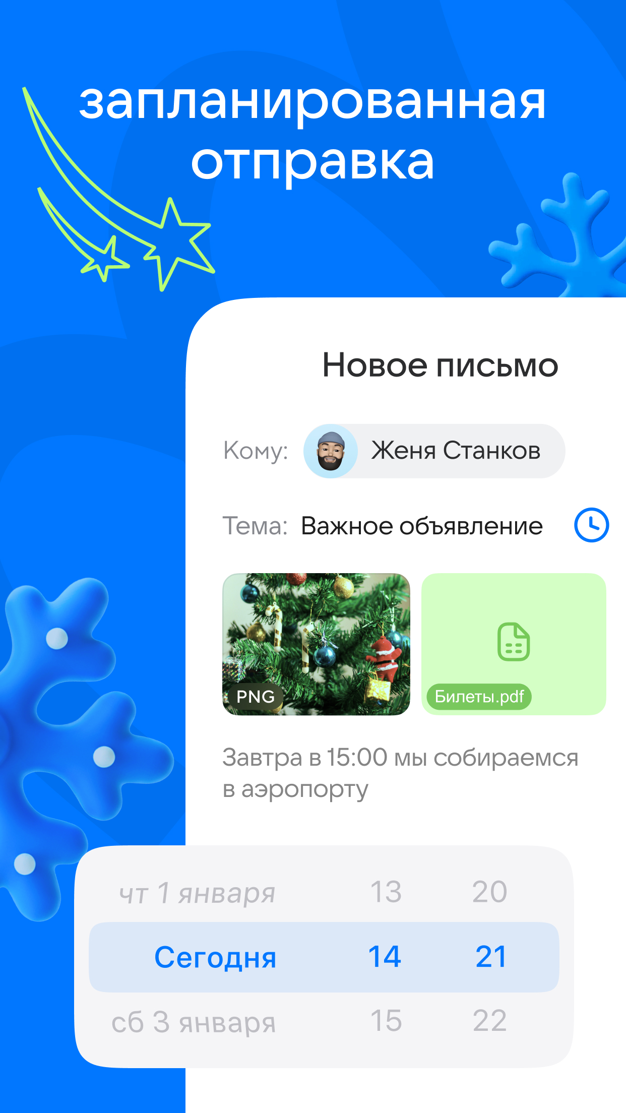 僅郵件應用程式中您需要的服務。具有神經網路的快速郵件、有用的日曆 - 將提醒您會議和計劃、計算假期、用於儲存照片、文件和掃描的雲端、筆記、新聞。