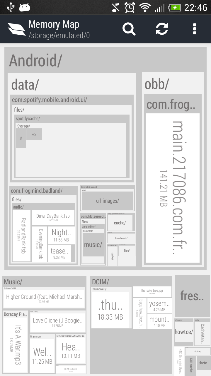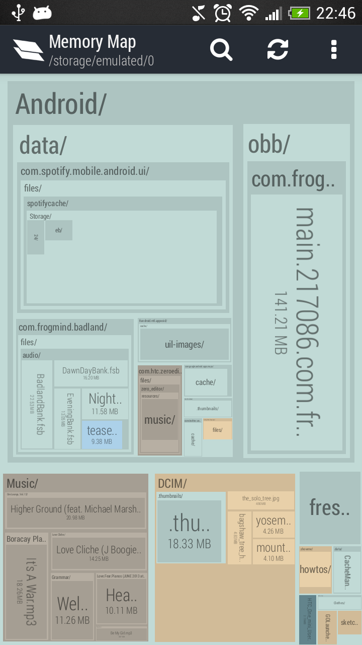 Memory Map is NOT another cache cleaner. It focuses on bringing you an overall view of your disk and allows you to delete your *own* files (pictures, videos, musics...) as well as cache files. To do that, Memory Map is based on a interactive map of all the files and folders contained in your disk. The bigger a file is on the screen, the bigger it is on the disk, it's that simple!