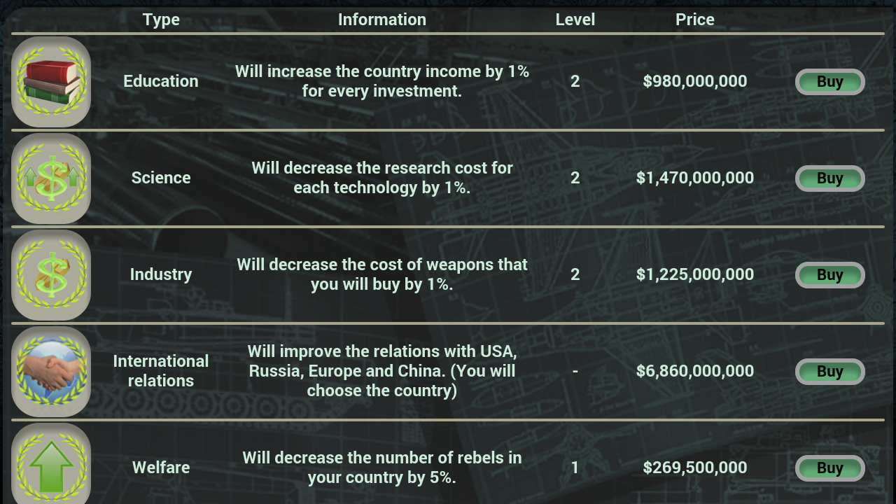 You vs 14 other AI countries. The game contain: Weapons suppliers, Spy Center, War Room, Diplomacy, Economy, Technologies, World News, Difficulties levels, Very smart AI...