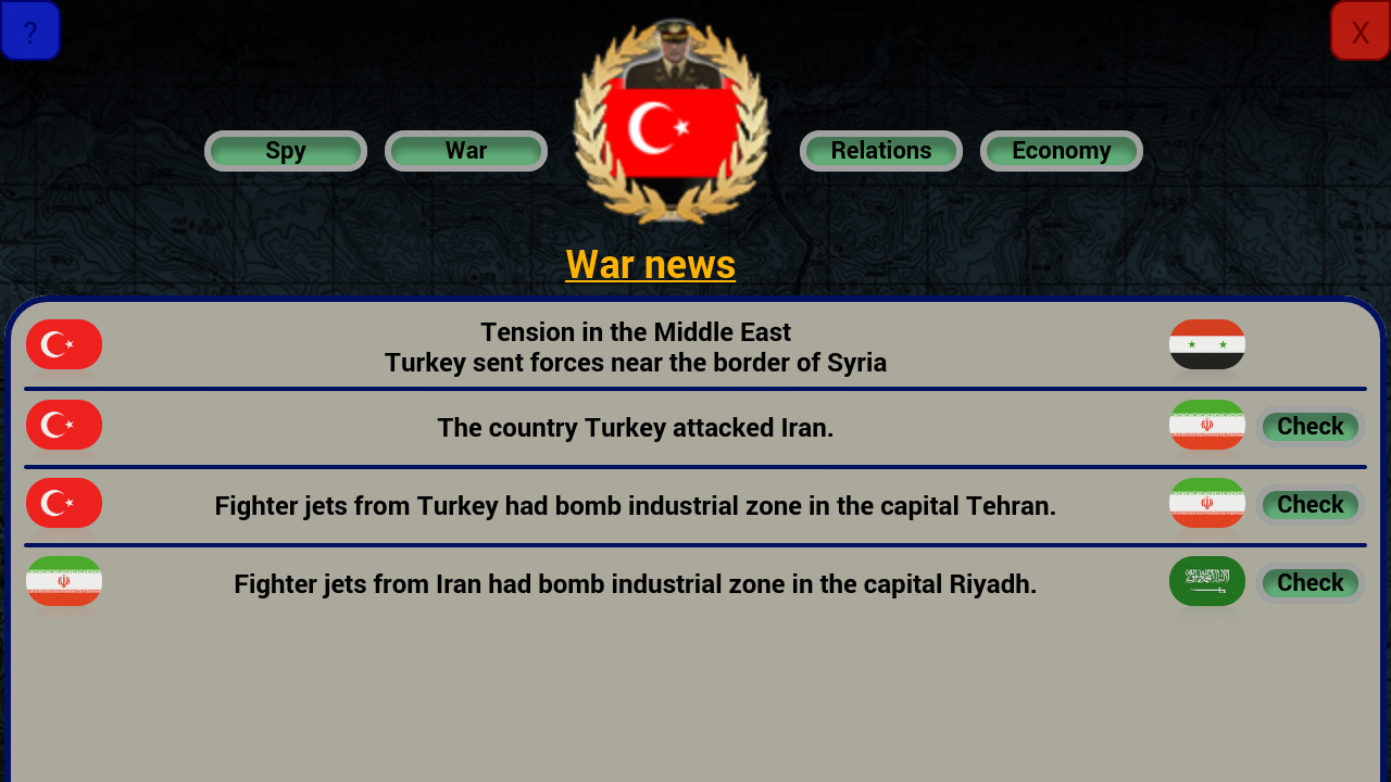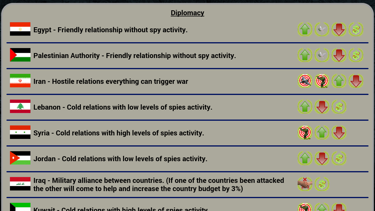 The year is 2027 and a big uprising took the existing government in your country. As the leader of the rebels you got unlimited authority in the country. The parliament got your nomination and you way to bring the country to be empire in the Middle East.