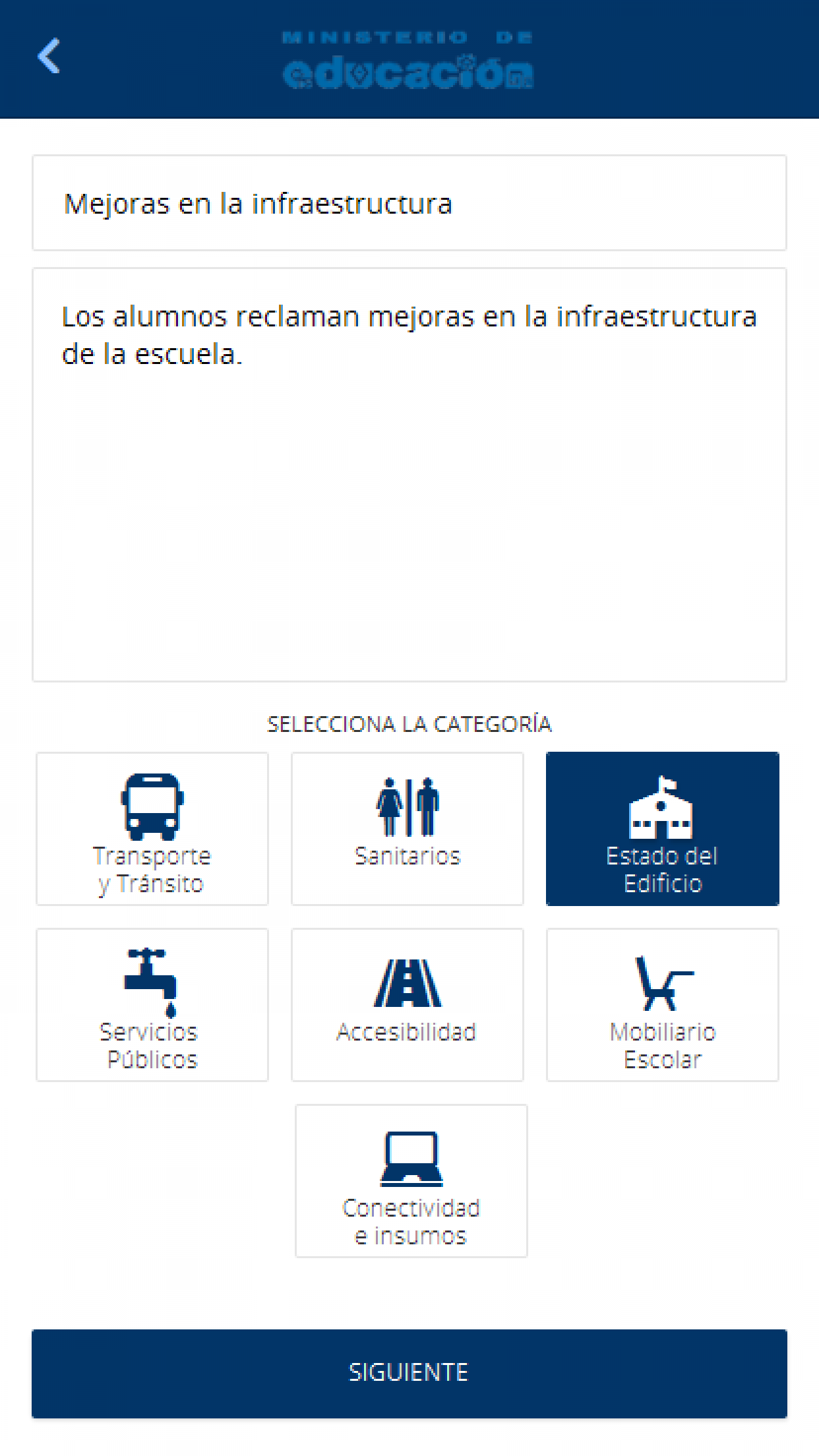 Tu Participación mejora tu Barrio Ministerio de Educación - BO es un mapa interactivo y participativo en donde los vecinos tienen la posibilidad de generar reportes ciudadanos de sus barrios, votar reportes de otros vecinos y difundirlos en las redes sociales. Así, los ciudadanos pueden impulsar acciones vecinales y recuperar el sentido de comunidad. Reporta, sugiere, transforma tu entorno Alguien tiene que dar el primer paso para transformar el espacio que lo rodea. Tu eres esa persona. Un vecino activo es aquel que reconoce y conoce las problemáticas de su zona y quiere participar para mejorar su calidad de vida y la de sus vecinos. Describe tu reporte Los problemas cotidianos afectan a miles de personas. Al reportar estos problemas con los detalles necesarios ponemos a disposición de todos los vecinos un lugar donde las sugerencias y los debates son bienvenidos. Así, colaboraremos para encontrar una solución entre todos. Busca el apoyo de tus vecinos Para que un reporte pueda ser solucionado, debe hacerse visible. Al compartirlo entre tus amigos y contactos logras una mayor viralización, lo que aumentará las chances de que cada reporte sea escuchado por más gente y logre un mayor alcance. Sugiere cambios o soluciones ¡No todo es quejas! Para solucionar nuestras problemáticas, debemos colaborar entre todos: participar activamente de los reportes, al sugerir y debatir entre los vecinos, permite encontrar nuevas soluciones y formas de afrontar los problemas de siempre. Nuestro Barrio puede mejorar cada día, con tu participación, sumate! Desarrollado por Kit Urbano.