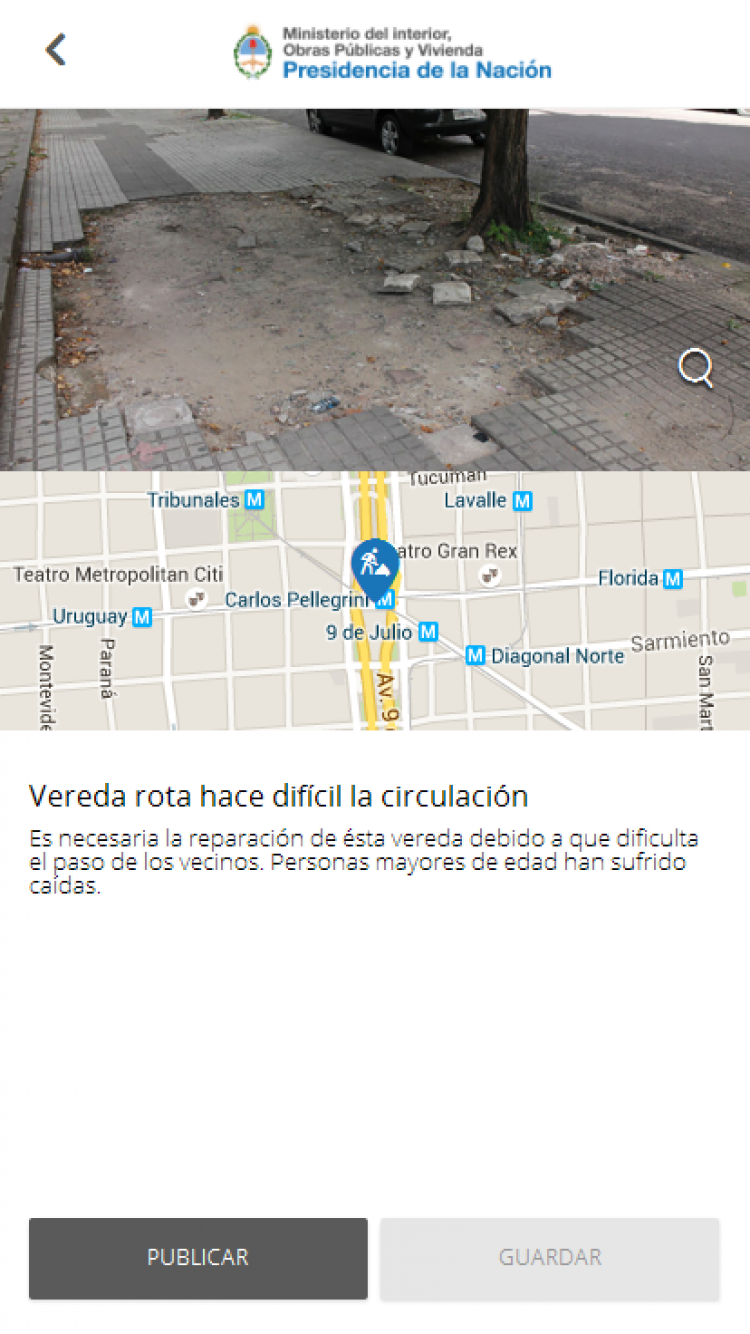 Tu Participación mejora tu Barrio Ministerio del Interior es un mapa interactivo y participativo en donde los vecinos tienen la posibilidad de generar reportes ciudadanos de sus barrios, votar reportes de otros vecinos y difundirlos en las redes sociales. Así, los ciudadanos pueden impulsar acciones vecinales y recuperar el sentido de comunidad. Reportá, sugerí, transformá tu entorno Alguien tiene que dar el primer paso para transformar el espacio que lo rodea. Vos sos esa persona. Un vecino activo es aquel que reconoce y conoce las problemáticas de su zona y quiere participar para mejorar su calidad de vida y la de sus vecinos. Describí tu reporte Los problemas cotidianos afectan a miles de personas. Al reportar estos problemas con los detalles necesarios ponemos a disposición de todos los vecinos un lugar donde las sugerencias y los debates son bienvenidos. Así, colaboraremos para encontrar una solución entre todos. Buscá el apoyo de tus vecinos Para que un reporte pueda ser solucionado, debe hacerse visible. Al compartirlo entre tus amigos y contactos lográs una mayor viralización, lo que aumentará las chances de que cada reporte sea escuchado por más gente y logre un mayor alcance. Sugerí cambios o soluciones ¡No todo es quejas! Para solucionar nuestras problemáticas, debemos colaborar entre todos: participar activamente de los reportes, al sugerir y debatir entre los vecinos, permite encontrar nuevas soluciones y formas de afrontar los problemas de siempre. Nuestro Barrio puede mejorar cada día, con tu participación, sumate! Desarrolado por Kit Urbano.
