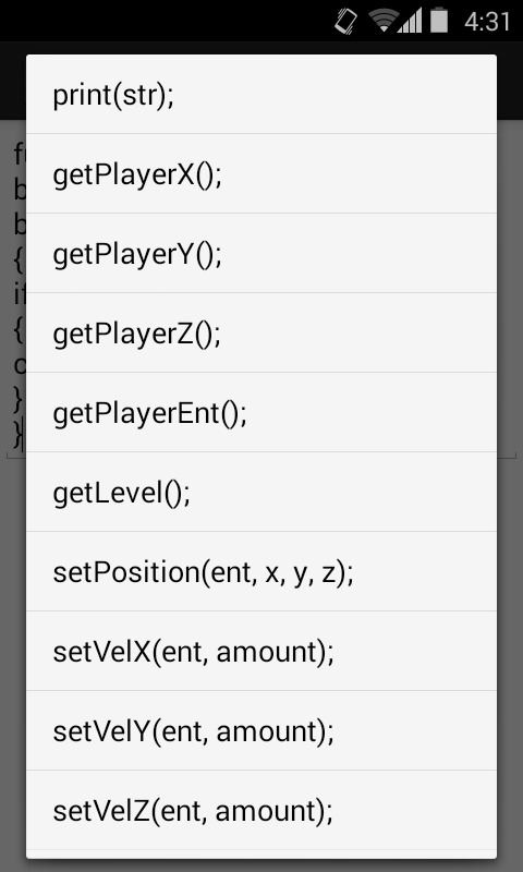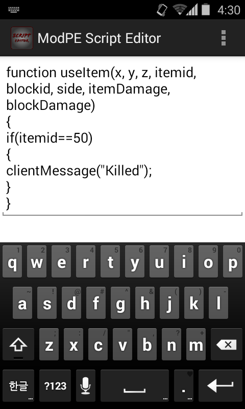 0.4 Download https://www.dropbox.com/s/uh8sjeus60wq5x3/ModPE%20Script%20Editor.apk This app help you when make a script. If you want to set yours script? You need two app! Minecraft - Pocket Edition and BlockLauncher
