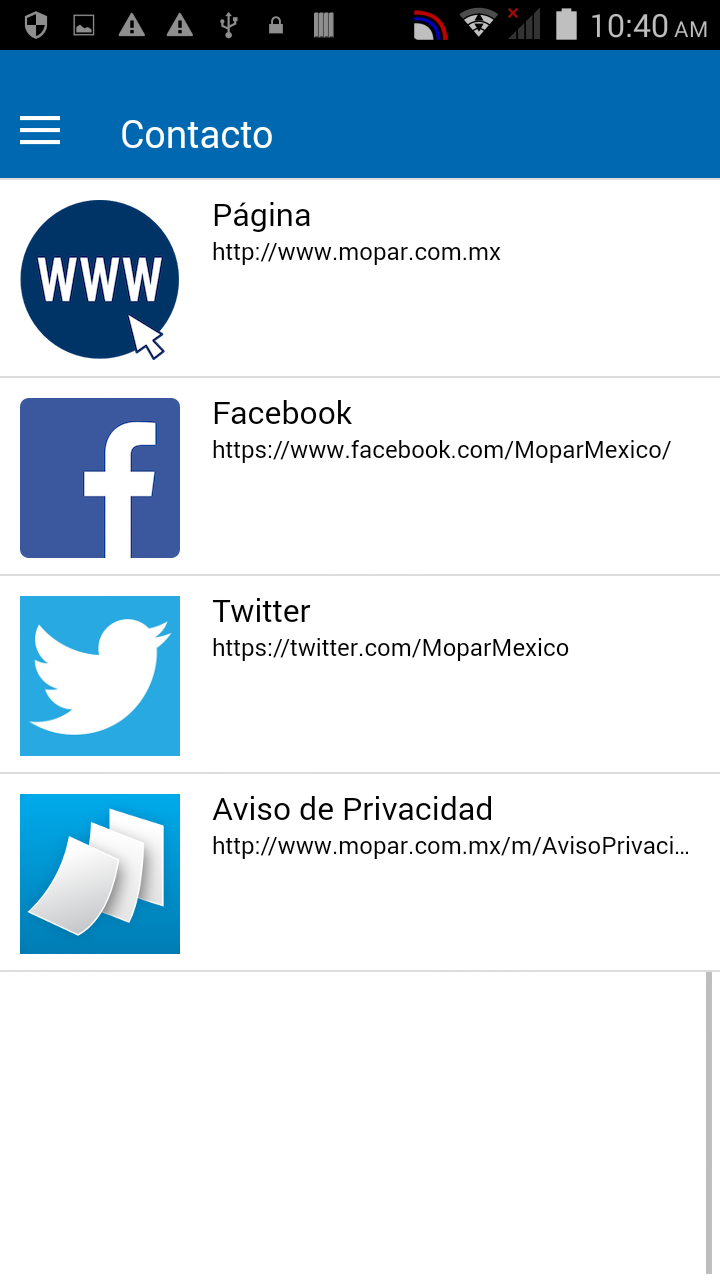 Contacto. Tendrás acceso a las redes sociales oficiales de Mopar, así como al sitio web oficial.