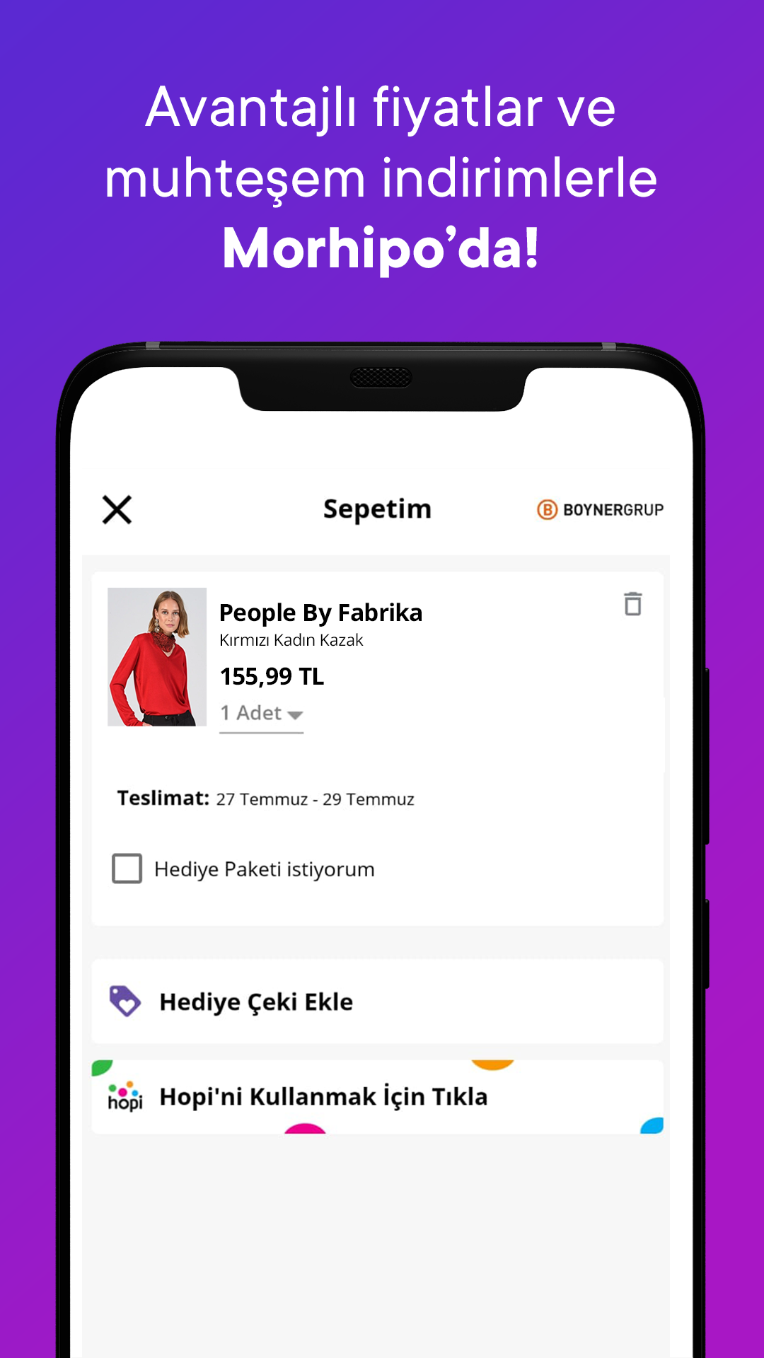 Morhipo.com mobil uygulamasında yapacağınız alışverişlerde ekstra indirim ve puan kazanmak için Hopi'yi kullanabilirsiniz。