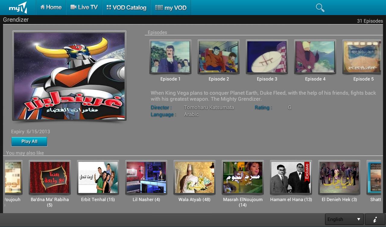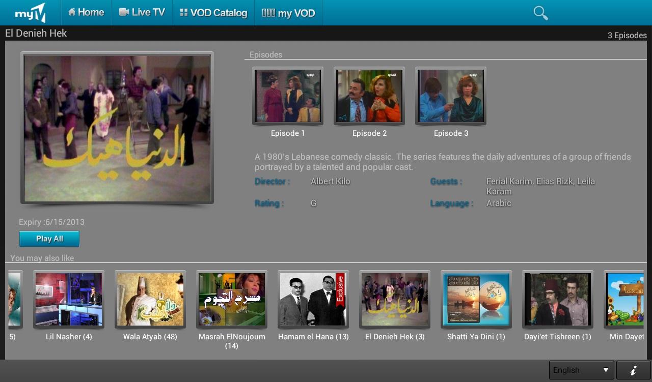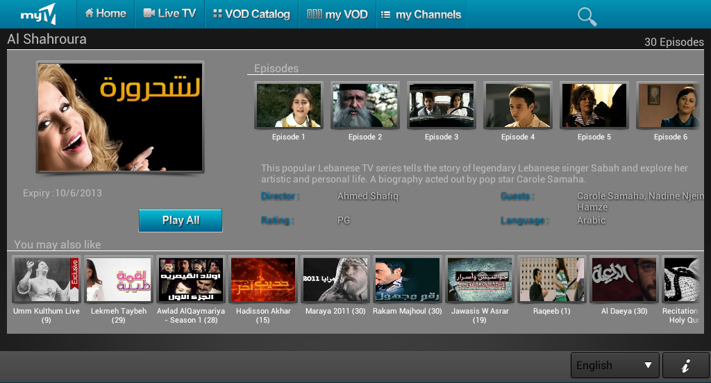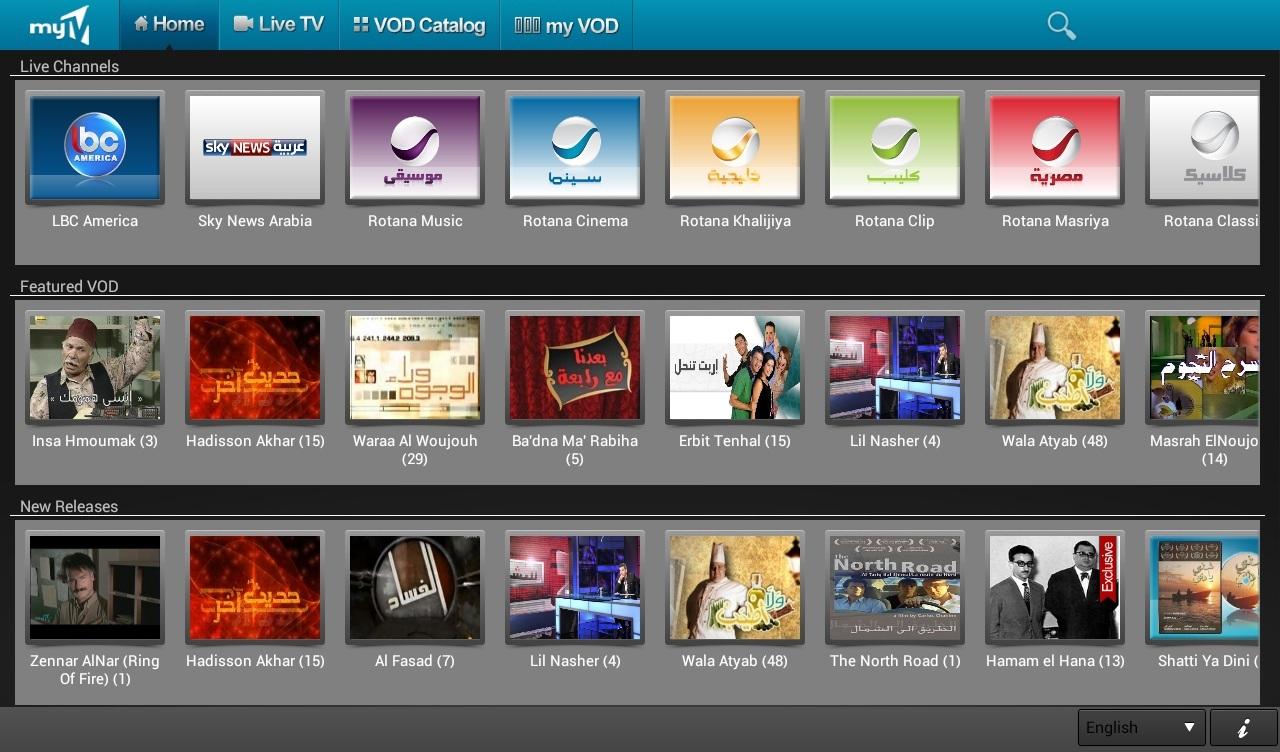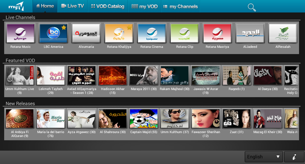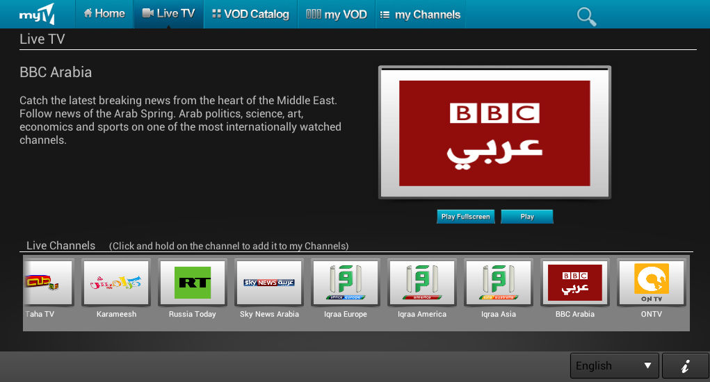 myTV provides Arabic-language television channels and Video on Demand to North/South America, Europe, Australia, New Zealand, and soon to be expanding to other countries. Easy and affordable, you can enjoy watching over 55 Arabic channels, from various networks, with options ranging to suit different Arab audiences, such as Rotana and Orbit channels, Nessma TV, Al Baghdadiya, Sky News Arabia, LBC, ONTV and many more. myTV also offers over 15,000 hours of premier movies and series from the Arab world, including Fairuz, Youssef Chahine, Ghouwar el Tosheh etc, as well as a vast library of religious/political shows, documentaries, concerts of famous singers, karaoke, family programs, cuisine, children and cartoons. For any questions, email