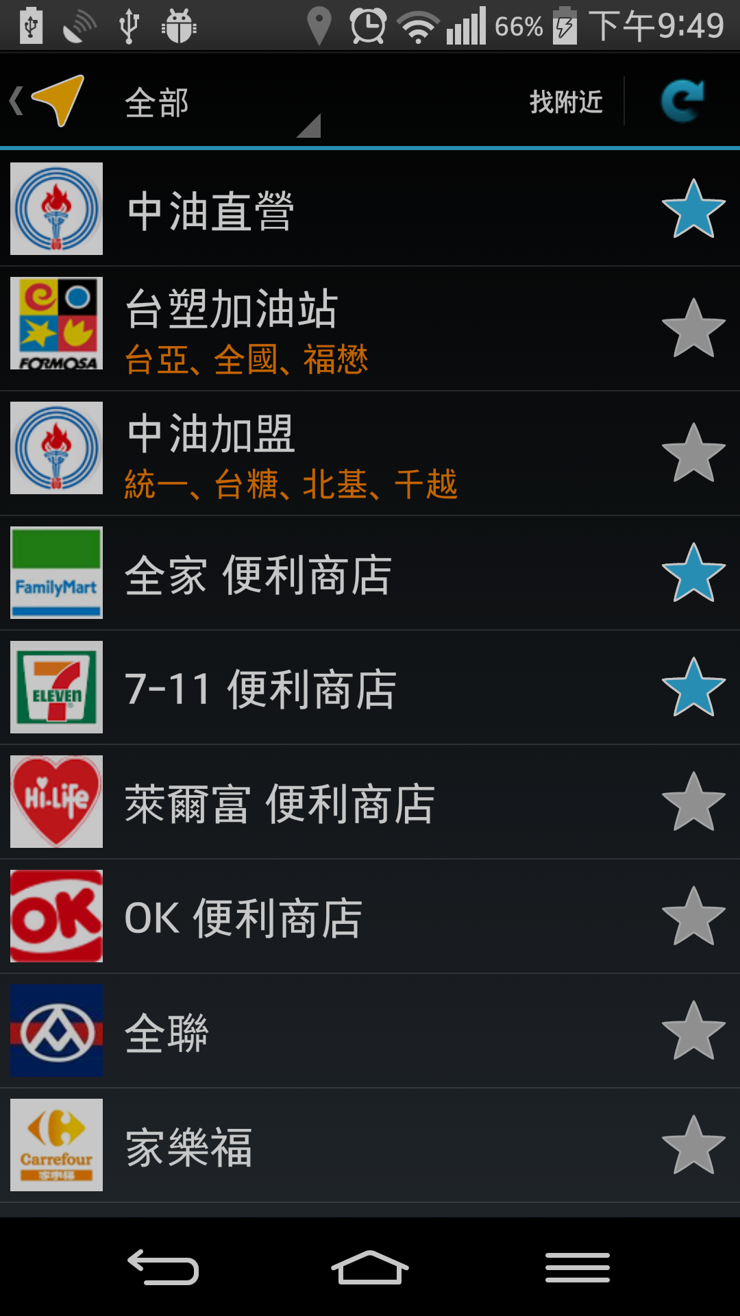 10.常用地點資料,位於主畫面選單中 > 常用地點資料庫,可下載離線使用,目前有 中油直營, iTaiwan, 火車站, 全家, 7-11, 郵局 , 麥當勞, 家樂福, starbucks, 85度C, 中油加盟, 台塑加油站, 中華電信直營, 萊爾富, 全聯, 大潤發, 頂好超市, 肯德基, 摩斯漢堡 ,頂呱呱 ,Subway, 必勝客, 達美樂, 伯朗咖啡, 丹提, cama, 怡客, 西雅圖, 壹咖啡, Coco, 橘子工坊, 天仁, 鮮茶道, 清玉, 屈臣氏, 康是美, 丁丁藥局, 燦坤, 全國電子, 大同3C, 台灣銀行, 國泰世華, 台新, 聯邦銀行, 中國信託, 合作金庫, 誠品, 金石堂, Homebox, 特力屋, 捷運, ubike, cbike, 玉山銀行, 警察局 之地點資訊, 並持續增加...