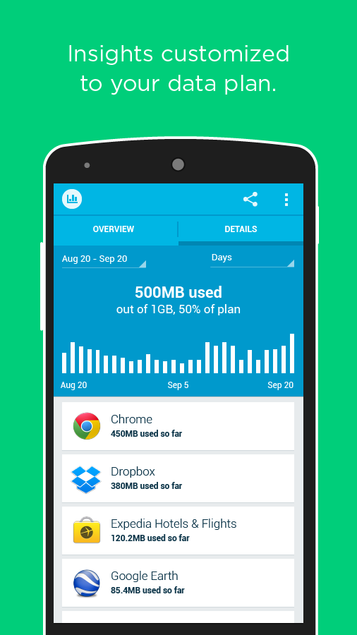 • 即時提醒:透過手機的通知,讓你瞭解何時即將達到數據上限,並顯示你在目前數據週期中的哪一天。