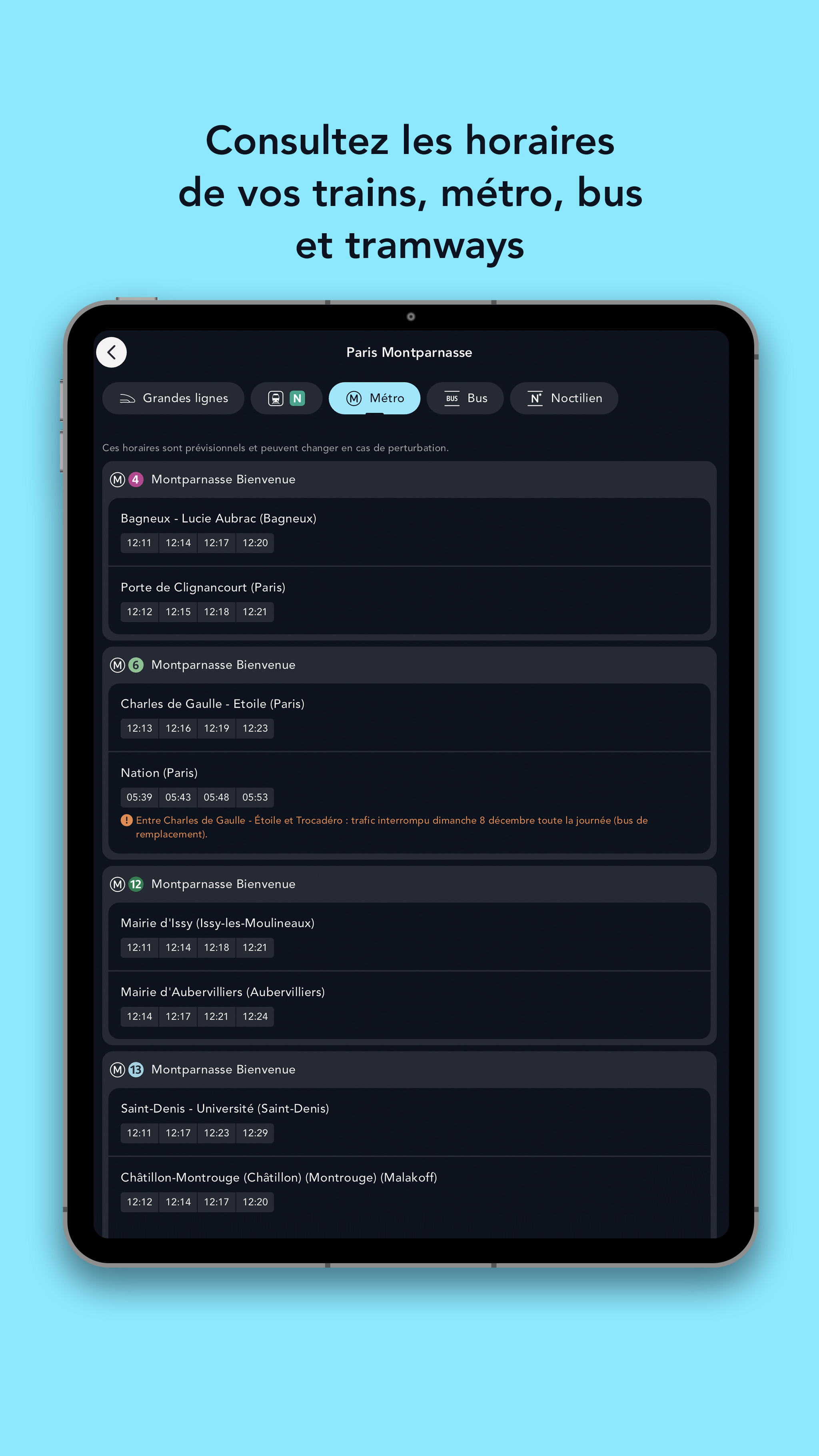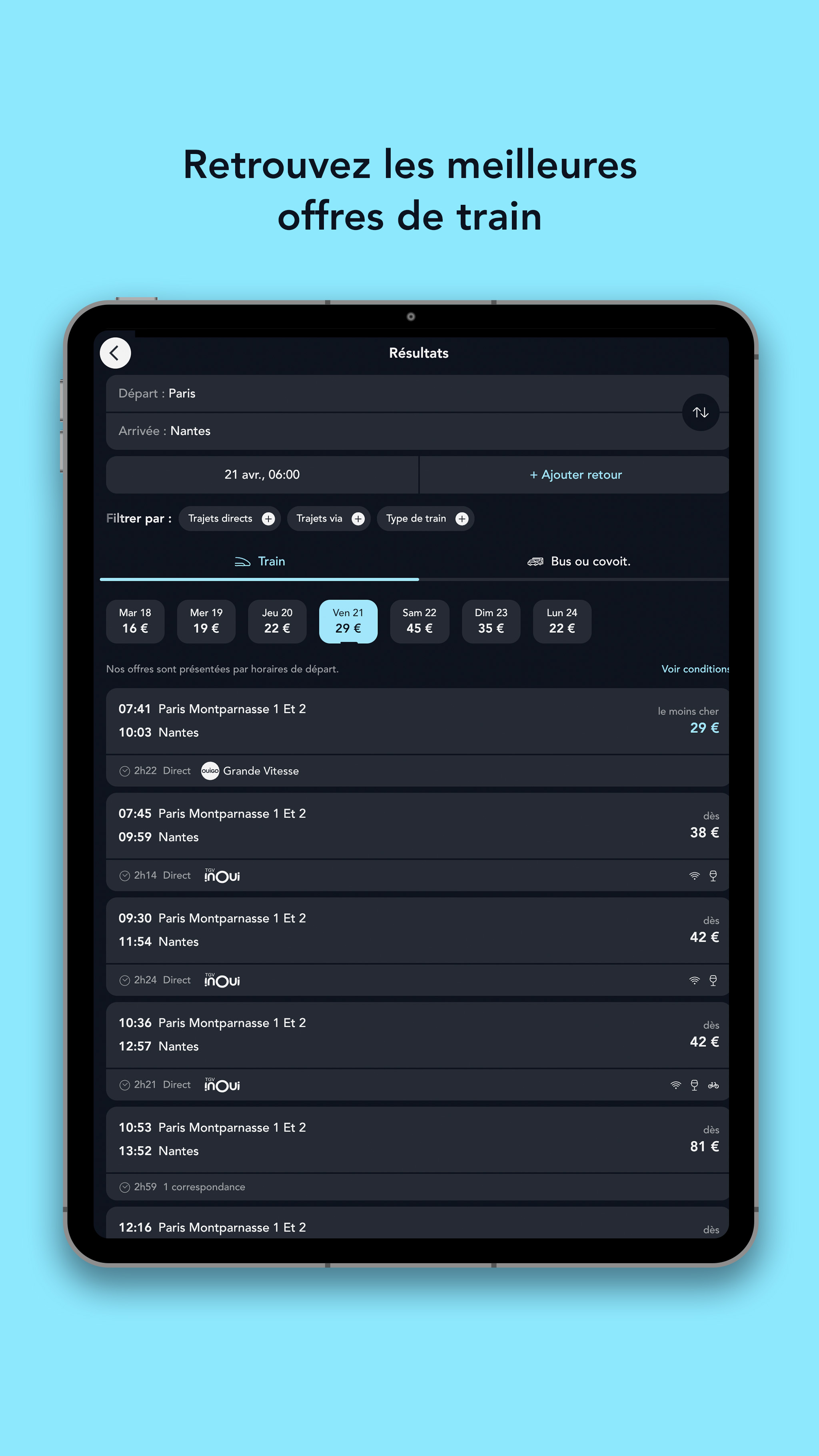 Lors de vos recherches d’horaires, vous pouvez maintenant afficher les résultats par destination. Depuis la rubrique « Horaires », recherchez votre gare de départ, puis indiquez directement votre destination. Seuls les horaires qui vous intéressent s’afficheront !